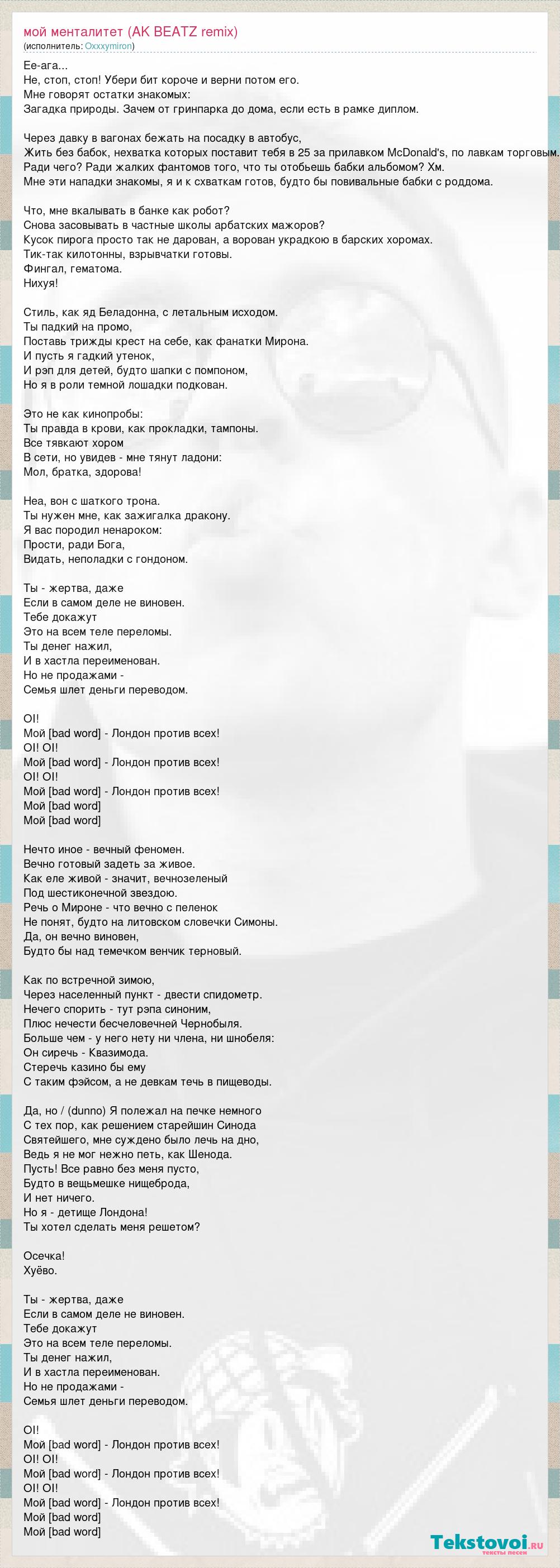 Ее-ага... Не, стоп, стоп! Убери бит короче и верни потом его. Мне говорят остатки знакомых: Загадка природы. Зачем от гринпарка до дома, если есть в рамке диплом. Через давку в вагонах бежать на посадку в автобус, Жить без бабок, нехватка которых поставит тебя в 25 за прилавком McDonald's, по лавкам торговым. Ради чего? Ради жалких фантомов того, что ты отобьешь бабки альбомом? Хм. Мне эти нападки знакомы, я и к схваткам готов, будто бы повивальные бабки с роддома. Что, мне вкалывать в банке как робот? Снова засовывать в частные школы арбатских мажоров? Кусок пирога просто так не дарован, а ворован украдкою в барских хоромах. Тик-так килотонны, взрывчатки готовы. Фингал, гематома. Нихуя! Стиль, как яд Беладонна, с летальным исходом. Ты падкий на промо, Поставь трижды крест на себе, как фанатки Мирона. И пусть я гадкий утенок, И рэп для детей, будто шапки с помпоном, Но я в роли темной лошадки подкован. Это не как кинопробы: Ты правда в крови, как прокладки, тампоны. Все тявкают хором В сети, но увидев - мне тянут ладони: Мол, братка, здорова! Неа, вон с шаткого трона. Ты нужен мне, как зажигалка дракону. Я вас породил ненароком: Прости, ради Бога, Видать, неполадки с гондоном. Ты - жертва, даже Если в самом деле не виновен. Тебе докажут Это на всем теле переломы. Ты денег нажил, И в хастла переименован. Но не продажами - Семья шлет деньги переводом. OI! Мой [bad word] - Лондон против всех! OI! OI! Мой [bad word] - Лондон против всех! OI! OI! Мой [bad word] - Лондон против всех! Мой [bad word] Мой [bad word] Нечто иное - вечный феномен. Вечно готовый задеть за живое. Как еле живой - значит, вечнозеленый Под шестиконечной звездою. Речь о Мироне - что вечно с пеленок Не понят, будто на литовском словечки Симоны. Да, он вечно виновен, Будто бы над темечком венчик терновый. Как по встречной зимою, Через населенный пункт - двести спидометр. Нечего спорить - тут рэпа синоним, Плюс нечести бесчеловечней Чернобыля. Больше чем - у него нету ни члена, ни шнобеля: Он сиречь - Квазимода. Стеречь казино бы ему С таким фэйсом, а не девкам течь в пищеводы. Да, но / (dunno) Я полежал на печке немного С тех пор, как решением старейшин Синода Святейшего, мне суждено было лечь на дно, Ведь я не мог нежно петь, как Шенода. Пусть! Все равно без меня пусто, Будто в вещьмешке нищеброда, И нет ничего. Но я - детище Лондона! Ты хотел сделать меня решетом? Осечка! Хуёво. Ты - жертва, даже Если в самом деле не виновен. Тебе докажут Это на всем теле переломы. Ты денег нажил, И в хастла переименован. Но не продажами - Семья шлет деньги переводом. OI! Мой [bad word] - Лондон против всех! OI! OI! Мой [bad word] - Лондон против всех! OI! OI! Мой [bad word] - Лондон против всех! Мой [bad word] Мой [bad word]