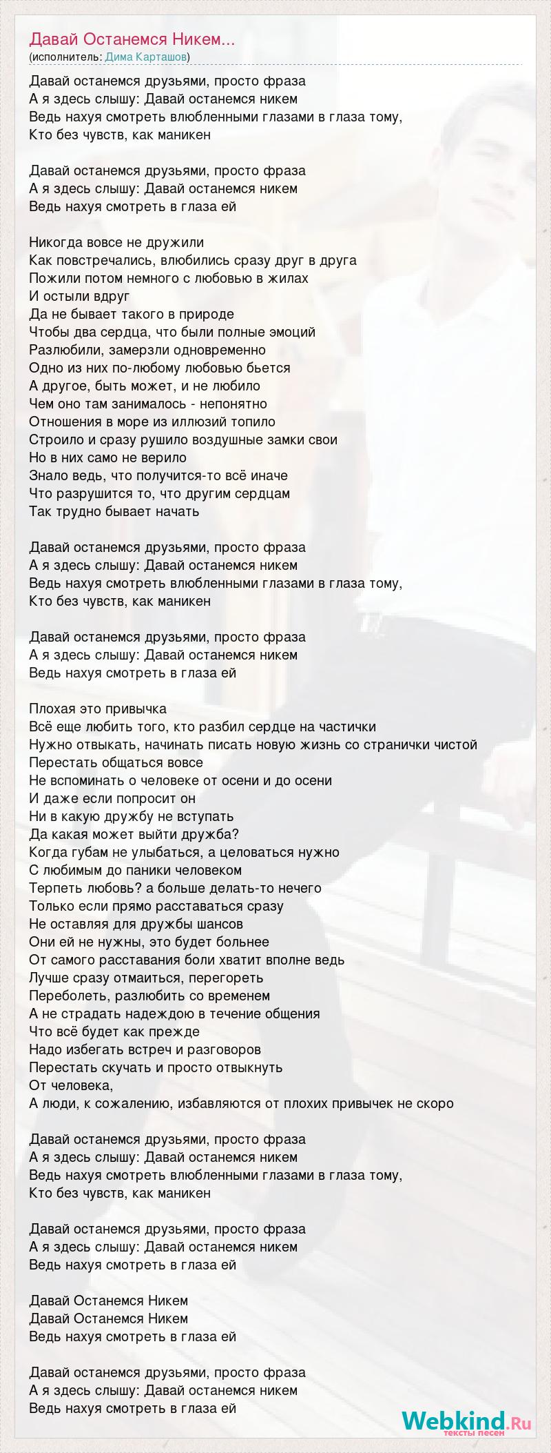 Давай останемся друзьями, просто фраза А я здесь слышу: Давай останемся никем Ведь нахуя смотреть влюбленными глазами в глаза тому, Кто без чувств, как маникен Давай останемся друзьями, просто фраза А я здесь слышу: Давай останемся никем Ведь нахуя смотреть в глаза ей Никогда вовсе не дружили Как повстречались, влюбились сразу друг в друга Пожили потом немного с любовью в жилах И остыли вдруг Да не бывает такого в природе Чтобы два сердца, что были полные эмоций Разлюбили, замерзли одновременно Одно из них по-любому любовью бьется А другое, быть может, и не любило Чем оно там занималось - непонятно Отношения в море из иллюзий топило Строило и сразу рушило воздушные замки свои Но в них само не верило Знало ведь, что получится-то всё иначе Что разрушится то, что другим сердцам Так трудно бывает начать Давай останемся друзьями, просто фраза А я здесь слышу: Давай останемся никем Ведь нахуя смотреть влюбленными глазами в глаза тому, Кто без чувств, как маникен Давай останемся друзьями, просто фраза А я здесь слышу: Давай останемся никем Ведь нахуя смотреть в глаза ей Плохая это привычка Всё еще любить того, кто разбил сердце на частички Нужно отвыкать, начинать писать новую жизнь со странички чистой Перестать общаться вовсе Не вспоминать о человеке от осени и до осени И даже если попросит он Ни в какую дружбу не вступать Да какая может выйти дружба? Когда губам не улыбаться, а целоваться нужно С любимым до паники человеком Терпеть любовь? а больше делать-то нечего Только если прямо расставаться сразу Не оставляя для дружбы шансов Они ей не нужны, это будет больнее От самого расставания боли хватит вполне ведь Лучше сразу отмаиться, перегореть Переболеть, разлюбить со временем А не страдать надеждою в течение общения Что всё будет как прежде Надо избегать встреч и разговоров Перестать скучать и просто отвыкнуть От человека, А люди, к сожалению, избавляются от плохих привычек не скоро Давай останемся друзьями, просто фраза А я здесь слышу: Давай останемся никем Ведь нахуя смотреть влюбленными глазами в глаза тому, Кто без чувств, как маникен Давай останемся друзьями, просто фраза А я здесь слышу: Давай останемся никем Ведь нахуя смотреть в глаза ей Давай Останемся Никем Давай Останемся Никем Ведь нахуя смотреть в глаза ей Давай останемся друзьями, просто фраза А я здесь слышу: Давай останемся никем Ведь нахуя смотреть в глаза ей