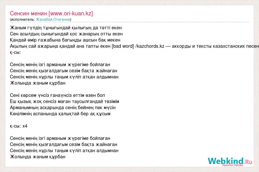 Жаным гүлдің тұнығындай қылығың да тәтті екен Сен асылдың сынығындай қос жанарың отты екен Қандай өмір ғажабына бағыңды ашсын бақ мекен Ақылың сай ажарыңа қандай ана тапты екен [bad word] /kazchords.kz — аккорды и тексты казахстанских песен қ-сы: Сенсің менің ізгі арманым жүрегіме бойлаған Сенсің менің қызғалдағым сезім бақта жайнаған Сенсің менің нұрлы таңым күліп атқан алдымнан Жолыңда жаным құрбан Сені көрсем үнсіз ғанаүнсіз өттім өзен боп Еш қызық жоқ сенсіз маған таусылғандай төзімім Арманымның асқарында сенің бейнең пәк мүсін Көңілімнің аспанында қалықтай бер ақ құсым қ-сы: х4 Сенсің менің ізгі арманым жүрегіме бойлаған Сенсің менің қызғалдағым сезім бақта жайнаған Сенсің менің нұрлы таңым күліп атқан алдымнан Жолыңда жаным құрбан