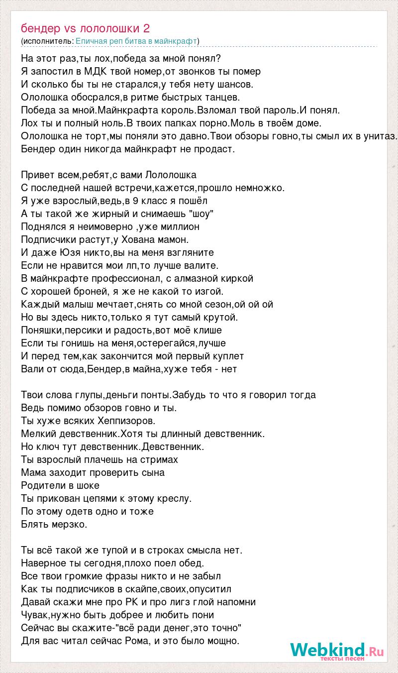 На этот раз,ты лох,победа за мной понял? Я запостил в МДК твой номер,от звонков ты помер И сколько бы ты не старался,у тебя нету шансов. Ололошка обосрался,в ритме быстрых танцев. Победа за мной.Майнкрафта король.Взломал твой пароль.И понял. Лох ты и полный ноль.В твоих папках порно.Моль в твоём доме. Ололошка не торт,мы поняли это давно.Твои обзоры говно,ты смыл их в унитаз. Бендер один никогда майнкрафт не продаст. Привет всем,ребят,с вами Лололошка С последней нашей встречи,кажется,прошло немножко. Я уже взрослый,ведь,в 9 класс я пошёл А ты такой же жирный и снимаешь "шоу" Поднялся я неимоверно ,уже миллион Подписчики растут,у Хована мамон. И даже Юзя никто,вы на меня взгляните Если не нравится мои лп,то лучше валите. В майнкрафте профессионал, с алмазной киркой С хорошей броней, я же не какой то изгой. Каждый малыш мечтает,снять со мной сезон,ой ой ой Но вы здесь никто,только я тут самый крутой. Поняшки,персики и радость,вот моё клише Если ты гонишь на меня,остерегайся,лучше И перед тем,как закончится мой первый куплет Вали от сюда,Бендер,в майна,хуже тебя - нет Твои слова глупы,деньги понты.Забудь то что я говорил тогда Ведь помимо обзоров говно и ты. Ты хуже всяких Хеппизоров. Мелкий девственник.Хотя ты длинный девственник. Но ключ тут девственник.Девственник. Ты взрослый плачешь на стримах Мама заходит проверить сына Родители в шоке Ты прикован цепями к этому креслу. По этому одетв одно и тоже Блять мерзко. Ты всё такой же тупой и в строках смысла нет. Наверное ты сегодня,плохо поел обед. Все твои громкие фразы никто и не забыл Как ты подписчиков в скайпе,своих,опуситил Давай скажи мне про РК и про лигз глой напомни Чувак,нужно быть добрее и любить пони Сейчас вы скажите-"всё ради денег,это точно" Для вас читал сейчас Рома, и это было мощно.