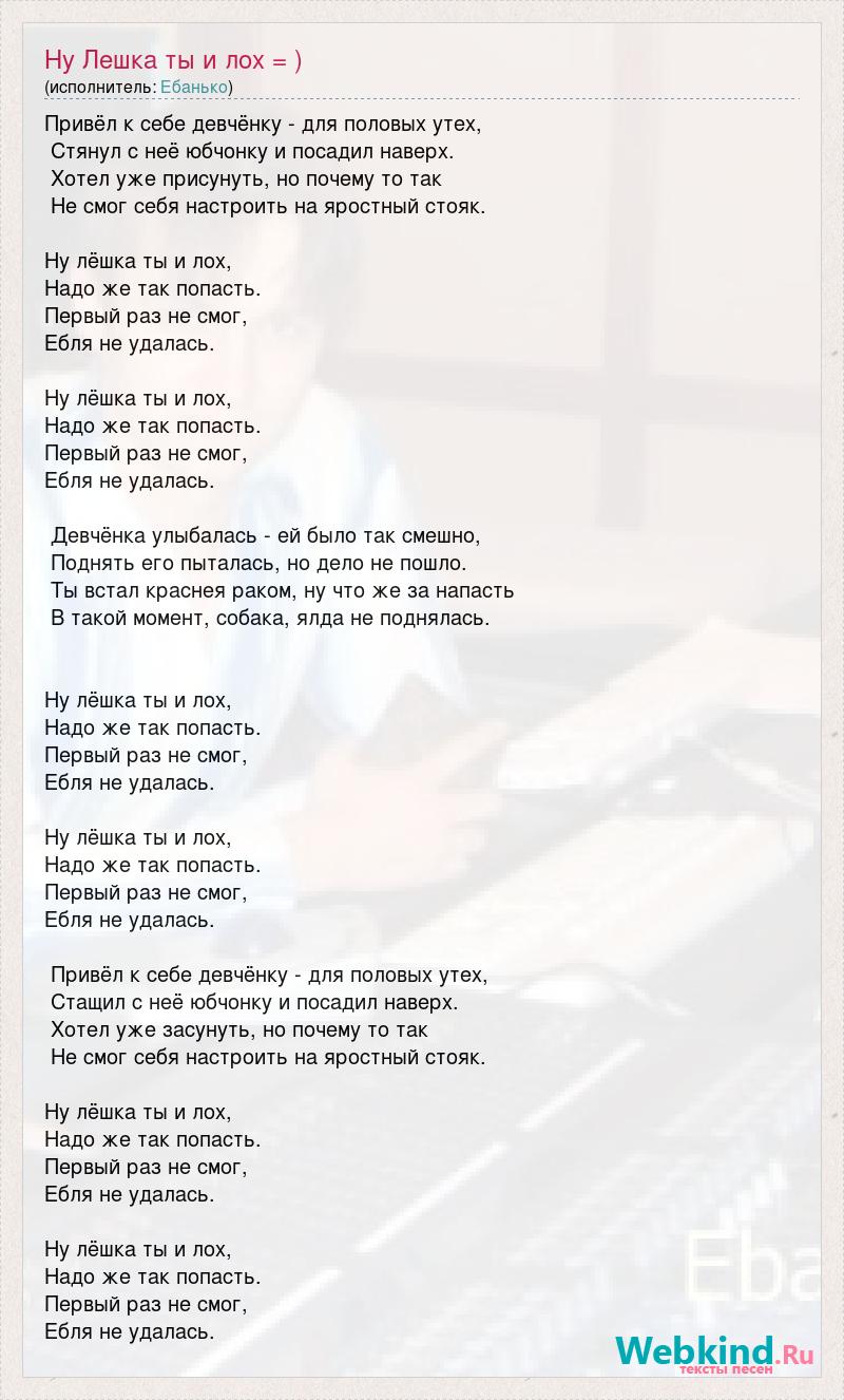 Привёл к себе девчёнку - для половых утех, Стянул с неё юбчонку и посадил наверх. Хотел уже присунуть, но почему то так Не смог себя настроить на яростный стояк. Ну лёшка ты и лох, Надо же так попасть. Первый раз не смог, Ебля не удалась. Ну лёшка ты и лох, Надо же так попасть. Первый раз не смог, Ебля не удалась. Девчёнка улыбалась - ей было так смешно, Поднять его пыталась, но дело не пошло. Ты встал краснея раком, ну что же за напасть В такой момент, собака, ялда не поднялась. Ну лёшка ты и лох, Надо же так попасть. Первый раз не смог, Ебля не удалась. Ну лёшка ты и лох, Надо же так попасть. Первый раз не смог, Ебля не удалась. Привёл к себе девчёнку - для половых утех, Стащил с неё юбчонку и посадил наверх. Хотел уже засунуть, но почему то так Не смог себя настроить на яростный стояк. Ну лёшка ты и лох, Надо же так попасть. Первый раз не смог, Ебля не удалась. Ну лёшка ты и лох, Надо же так попасть. Первый раз не смог, Ебля не удалась.
