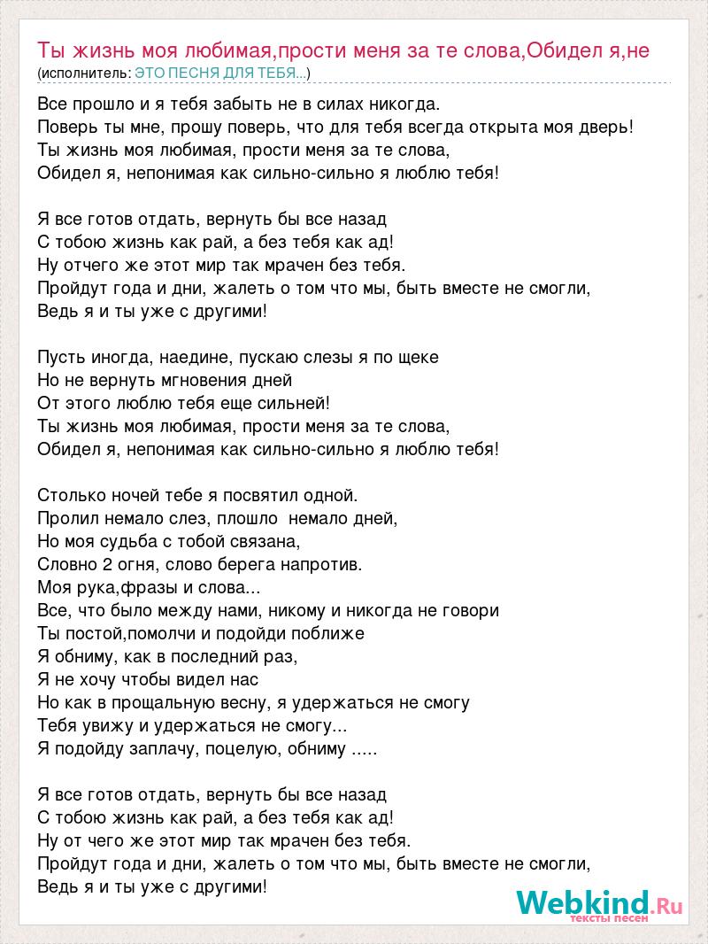Все прошло и я тебя забыть не в силах никогда. Поверь ты мне, прошу поверь, что для тебя всегда открыта моя дверь! Ты жизнь моя любимая, прости меня за те слова, Обидел я, непонимая как сильно-сильно я люблю тебя! Я все готов отдать, вернуть бы все назад С тобою жизнь как рай, а без тебя как ад! Ну отчего же этот мир так мрачен без тебя. Пройдут года и дни, жалеть о том что мы, быть вместе не смогли, Ведь я и ты уже с другими! Пусть иногда, наедине, пускаю слезы я по щеке Но не вернуть мгновения дней От этого люблю тебя еще сильней! Ты жизнь моя любимая, прости меня за те слова, Обидел я, непонимая как сильно-сильно я люблю тебя! Столько ночей тебе я посвятил одной. Пролил немало слез, плошло немало дней, Но моя судьба с тобой связана, Словно 2 огня, слово берега напротив. Моя рука,фразы и слова... Все, что было между нами, никому и никогда не говори Ты постой,помолчи и подойди поближе Я обниму, как в последний раз, Я не хочу чтобы видел нас Но как в прощальную весну, я удержаться не смогу Тебя увижу и удержаться не смогу... Я подойду заплачу, поцелую, обниму ..... Я все готов отдать, вернуть бы все назад С тобою жизнь как рай, а без тебя как ад! Ну от чего же этот мир так мрачен без тебя. Пройдут года и дни, жалеть о том что мы, быть вместе не смогли, Ведь я и ты уже с другими!