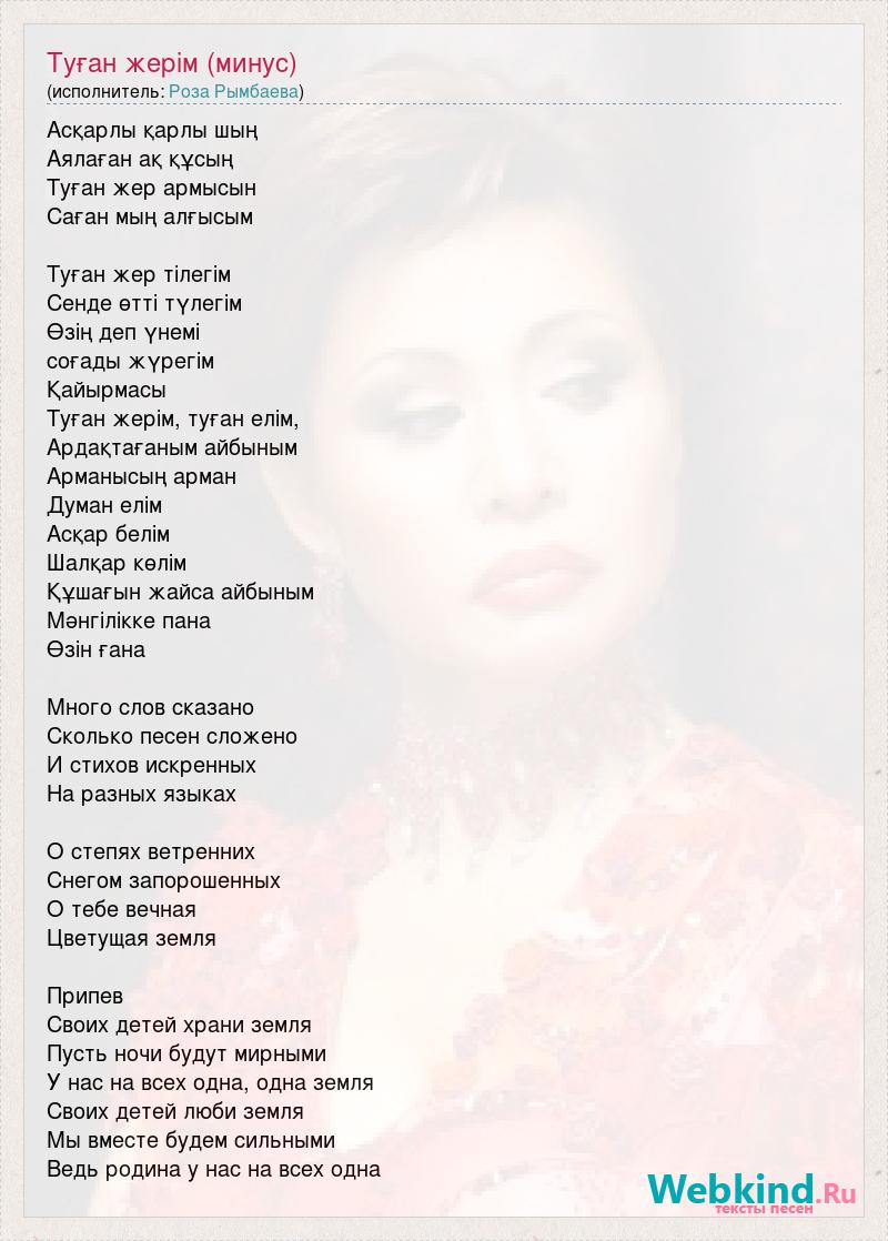 Асқарлы қарлы шың Аялаған ақ құсың Туған жер армысын Саған мың алғысым Туған жер тілегім Сенде өтті түлегім Өзің деп үнемі соғады жүрегім Қайырмасы Туған жерім, туған елім, Ардақтағаным айбыным Арманысың арман Думан елім Асқар белім Шалқар көлім Құшағын жайса айбыным Мәнгілікке пана Өзін ғана Много слов сказано Сколько песен сложено И стихов искренных На разных языках О степях ветренних Снегом запорошенных О тебе вечная Цветущая земля Припев Своих детей храни земля Пусть ночи будут мирными У нас на всех одна, одна земля Своих детей люби земля Мы вместе будем сильными Ведь родина у нас на всех одна