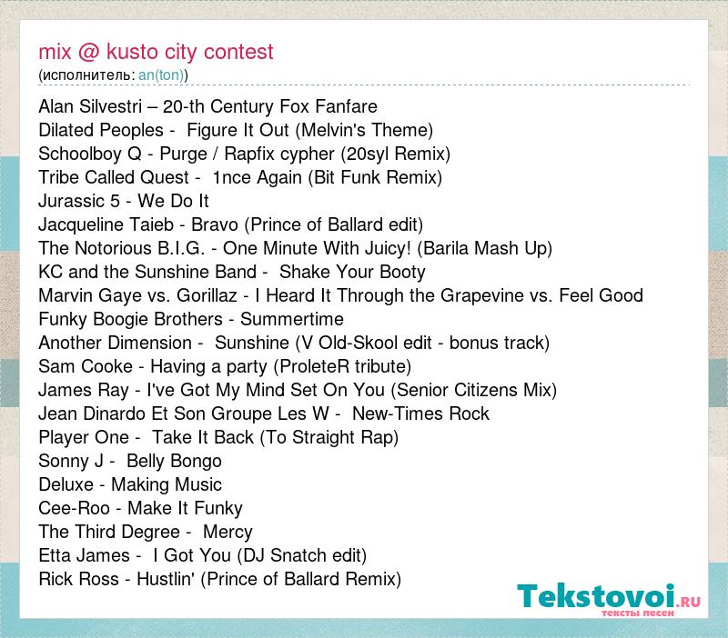 Alan Silvestri – 20-th Century Fox Fanfare Dilated Peoples - Figure It Out (Melvin's Theme) Schoolboy Q - Purge / Rapfix cypher (20syl Remix) Tribe Called Quest - 1nce Again (Bit Funk Remix) Jurassic 5 - We Do It Jacqueline Taieb - Bravo (Prince of Ballard edit) The Notorious B.I.G. - One Minute With Juicy! (Barila Mash Up) KC and the Sunshine Band - Shake Your Booty Marvin Gaye vs. Gorillaz - I Heard It Through the Grapevine vs. Feel Good Funky Boogie Brothers - Summertime Another Dimension - Sunshine (V Old-Skool edit - bonus track) Sam Cooke - Having a party (ProleteR tribute) James Ray - I've Got My Mind Set On You (Senior Citizens Mix) Jean Dinardo Et Son Groupe Les W - New-Times Rock Player One - Take It Back (To Straight Rap) Sonny J - Belly Bongo Deluxe - Making Music Cee-Roo - Make It Funky The Third Degree - Mercy Etta James - I Got You (DJ Snatch edit) Rick Ross - Hustlin' (Prince of Ballard Remix)