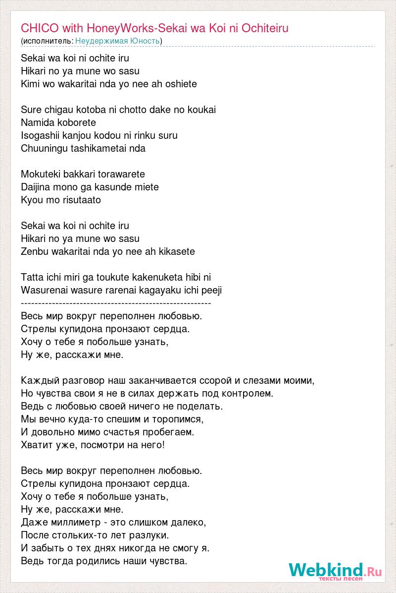 Sekai wa koi ni ochite iru Hikari no ya mune wo sasu Kimi wo wakaritai nda yo nee ah oshiete Sure chigau kotoba ni chotto dake no koukai Namida koborete Isogashii kanjou kodou ni rinku suru Chuuningu tashikametai nda Mokuteki bakkari torawarete Daijina mono ga kasunde miete Kyou mo risutaato Sekai wa koi ni ochite iru Hikari no ya mune wo sasu Zenbu wakaritai nda yo nee ah kikasete Tatta ichi miri ga toukute kakenuketa hibi ni Wasurenai wasure rarenai kagayaku ichi peeji ------------------------------------------------------- Весь мир вокруг переполнен любовью. Стрелы купидона пронзают сердца. Хочу о тебе я побольше узнать, Ну же, расскажи мне. Каждый разговор наш заканчивается ссорой и слезами моими, Но чувства свои я не в силах держать под контролем. Ведь с любовью своей ничего не поделать. Мы вечно куда-то спешим и торопимся, И довольно мимо счастья пробегаем. Хватит уже, посмотри на него! Весь мир вокруг переполнен любовью. Стрелы купидона пронзают сердца. Хочу о тебе я побольше узнать, Ну же, расскажи мне. Даже миллиметр - это слишком далеко, После стольких-то лет разлуки. И забыть о тех днях никогда не смогу я. Ведь тогда родились наши чувства.