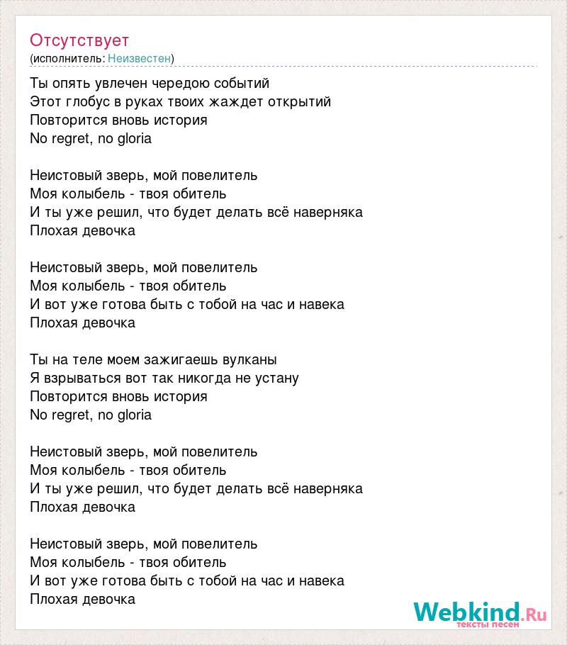 Ты опять увлечен чередою событий Этот глобус в руках твоих жаждет открытий Повторится вновь история No regret, no gloria Неистовый зверь, мой повелитель Моя колыбель - твоя обитель И ты уже решил, что будет делать всё наверняка Плохая девочка Неистовый зверь, мой повелитель Моя колыбель - твоя обитель И вот уже готова быть с тобой на час и навека Плохая девочка Ты на теле моем зажигаешь вулканы Я взрываться вот так никогда не устану Повторится вновь история No regret, no gloria Неистовый зверь, мой повелитель Моя колыбель - твоя обитель И ты уже решил, что будет делать всё наверняка Плохая девочка Неистовый зверь, мой повелитель Моя колыбель - твоя обитель И вот уже готова быть с тобой на час и навека Плохая девочка