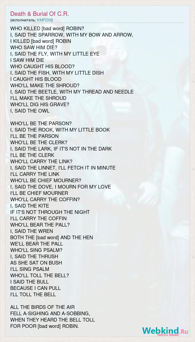 WHO KILLED [bad word] ROBIN? I, SAID THE SPARROW, WITH MY BOW AND ARROW, I KILLED [bad word] ROBIN WHO SAW HIM DIE? I, SAID THE FLY, WITH MY LITTLE EYE I SAW HIM DIE WHO CAUGHT HIS BLOOD? I, SAID THE FISH, WITH MY LITTLE DISH I CAUGHT HIS BLOOD WHO'LL MAKE THE SHROUD? I, SAID THE BEETLE, WITH MY THREAD AND NEEDLE I'LL MAKE THE SHROUD WHO'LL DIG HIS GRAVE? I, SAID THE OWL WHO'LL BE THE PARSON? I, SAID THE ROOK, WITH MY LITTLE BOOK I'LL BE THE PARSON WHO'LL BE THE CLERK? I, SAID THE LARK, IF IT'S NOT IN THE DARK I'LL BE THE CLERK WHO'LL CARRY THE LINK? I, SAID THE LINNET, I'LL FETCH IT IN MINUTE I'LL CARRY THE LINK WHO'LL BE CHIEF MOURNER? I, SAID THE DOVE, I MOURN FOR MY LOVE I'LL BE CHIEF MOURNER WHO'LL CARRY THE COFFIN? I, SAID THE KITE IF IT'S NOT THROUGH THE NIGHT I'LL CARRY THE COFFIN WHO'LL BEAR THE PALL? I, SAID THE WREN BOTH THE [bad word] AND THE HEN WE'LL BEAR THE PALL WHO'LL SING PSALM? I, SAID THE THRUSH AS SHE SAT ON BUSH I'LL SING PSALM WHO'LL TOLL THE BELL? I SAID THE BULL BECAUSE I CAN PULL I'LL TOLL THE BELL ALL THE BIRDS OF THE AIR FELL A-SIGHING AND A-SOBBING, WHEN THEY HEARD THE BELL TOLL FOR POOR [bad word] ROBIN.