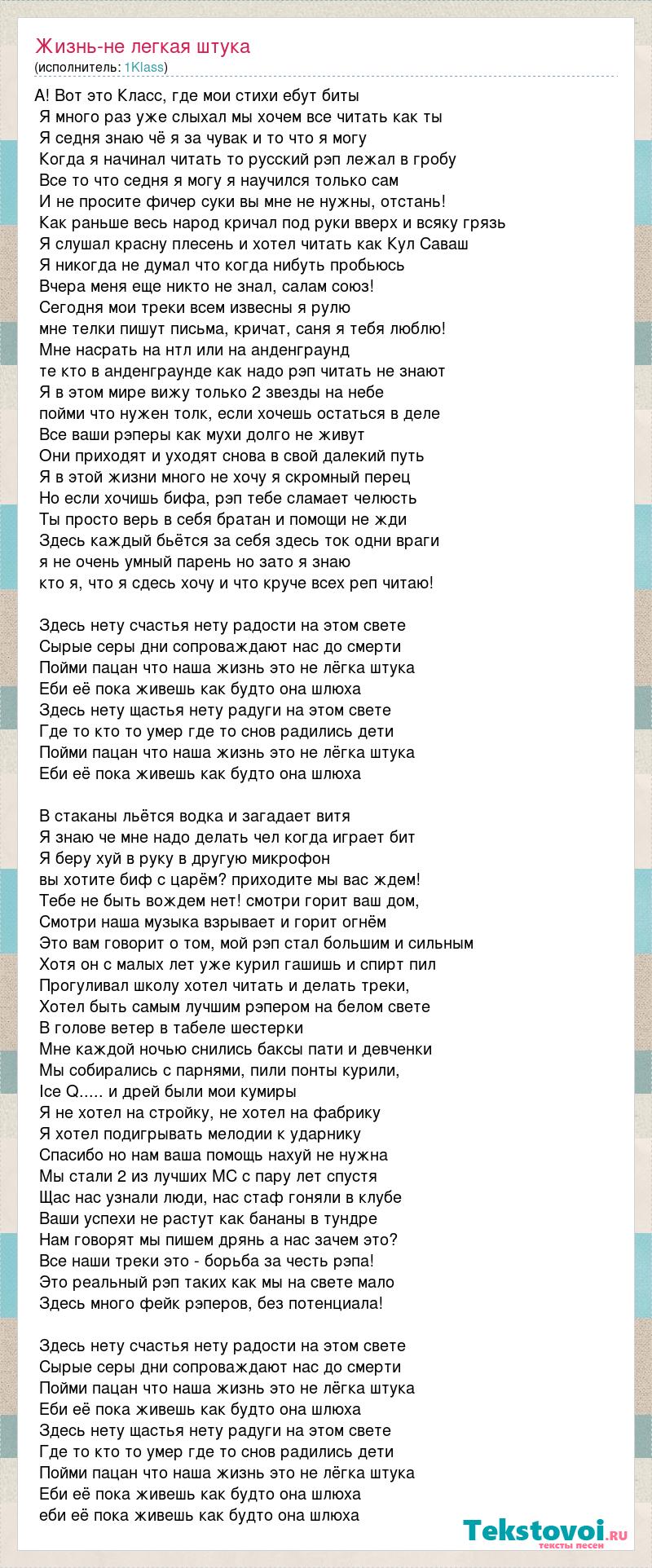 А! Вот это Класс, где мои стихи ебут биты Я много раз уже слыхал мы хочем все читать как ты Я седня знаю чё я за чувак и то что я могу Когда я начинал читать то русский рэп лежал в гробу Все то что седня я могу я научился только сам И не просите фичер суки вы мне не нужны, отстань! Как раньше весь народ кричал под руки вверх и всяку грязь Я слушал красну плесень и хотел читать как Кул Саваш Я никогда не думал что когда нибуть пробьюсь Вчера меня еще никто не знал, салам союз! Сегодня мои треки всем извесны я рулю мне телки пишут письма, кричат, саня я тебя люблю! Мне насрать на нтл или на анденграунд те кто в анденграунде как надо рэп читать не знают Я в этом мире вижу только 2 звезды на небе пойми что нужен толк, если хочешь остаться в деле Все ваши рэперы как мухи долго не живут Они приходят и уходят снова в свой далекий путь Я в этой жизни много не хочу я скромный перец Но если хочишь бифа, рэп тебе сламает челюсть Ты просто верь в себя братан и помощи не жди Здесь каждый бьётся за себя здесь ток одни враги я не очень умный парень но зато я знаю кто я, что я сдесь хочу и что круче всех реп читаю! Здесь нету счастья нету радости на этом свете Сырые серы дни сопроваждают нас до смерти Пойми пацан что наша жизнь это не лёгка штука Еби её пока живешь как будто она шлюха Здесь нету щастья нету радуги на этом свете Где то кто то умер где то снов радились дети Пойми пацан что наша жизнь это не лёгка штука Еби её пока живешь как будто она шлюха В стаканы льётся водка и загадает витя Я знаю че мне надо делать чел когда играет бит Я беру хуй в руку в другую микрофон вы хотите биф с царём? приходите мы вас ждем! Тебе не быть вождем нет! смотри горит ваш дом, Смотри наша музыка взрывает и горит огнём Это вам говорит о том, мой рэп стал большим и сильным Хотя он с малых лет уже курил гашишь и спирт пил Прогуливал школу хотел читать и делать треки, Хотел быть самым лучшим рэпером на белом свете В голове ветер в табеле шестерки Мне каждой ночью снились баксы пати и девченки Мы собирались с парнями, пили понты курили, Ice Q..... и дрей были мои кумиры Я не хотел на стройку, не хотел на фабрику Я хотел подигрывать мелодии к ударнику Спасибо но нам ваша помощь нахуй не нужна Мы стали 2 из лучших МС с пару лет спустя Щас нас узнали люди, нас стаф гоняли в клубе Ваши успехи не растут как бананы в тундре Нам говорят мы пишем дрянь а нас зачем это? Все наши треки это - борьба за честь рэпа! Это реальный рэп таких как мы на свете мало Здесь много фейк рэперов, без потенциала! Здесь нету счастья нету радости на этом свете Сырые серы дни сопроваждают нас до смерти Пойми пацан что наша жизнь это не лёгка штука Еби её пока живешь как будто она шлюха Здесь нету щастья нету радуги на этом свете Где то кто то умер где то снов радились дети Пойми пацан что наша жизнь это не лёгка штука Еби её пока живешь как будто она шлюха еби её пока живешь как будто она шлюха