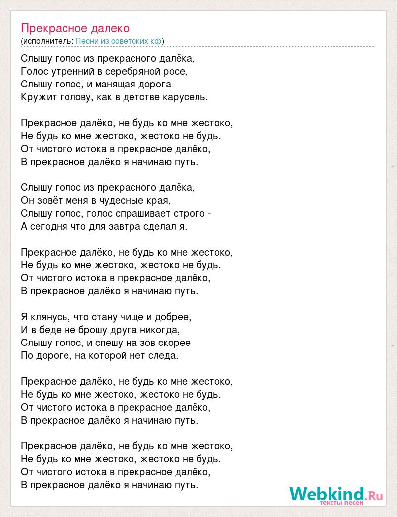 Слышу голос из прекрасного далёка, Голос утренний в серебряной росе, Слышу голос, и манящая дорога Кружит голову, как в детстве карусель. Прекрасное далёко, не будь ко мне жестоко, Не будь ко мне жестоко, жестоко не будь. От чистого истока в прекрасное далёко, В прекрасное далёко я начинаю путь. Слышу голос из прекрасного далёка, Он зовёт меня в чудесные края, Слышу голос, голос спрашивает строго - А сегодня что для завтра сделал я. Прекрасное далёко, не будь ко мне жестоко, Не будь ко мне жестоко, жестоко не будь. От чистого истока в прекрасное далёко, В прекрасное далёко я начинаю путь. Я клянусь, что стану чище и добрее, И в беде не брошу друга никогда, Слышу голос, и спешу на зов скорее По дороге, на которой нет следа. Прекрасное далёко, не будь ко мне жестоко, Не будь ко мне жестоко, жестоко не будь. От чистого истока в прекрасное далёко, В прекрасное далёко я начинаю путь. Прекрасное далёко, не будь ко мне жестоко, Не будь ко мне жестоко, жестоко не будь. От чистого истока в прекрасное далёко, В прекрасное далёко я начинаю путь.