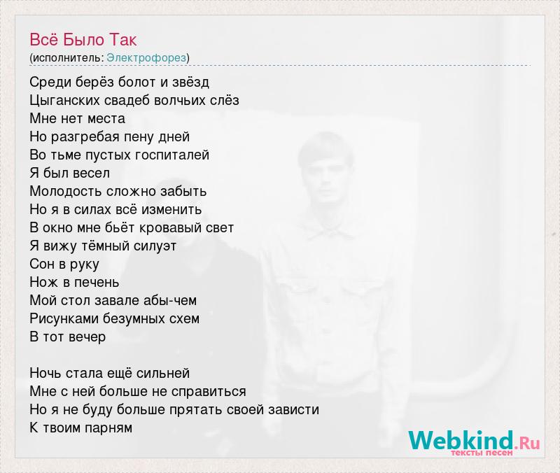 Среди берёз болот и звёзд Цыганских свадеб волчьих слёз Мне нет места Но разгребая пену дней Во тьме пустых госпиталей Я был весел Молодость сложно забыть Но я в силах всё изменить В окно мне бьёт кровавый свет Я вижу тёмный силуэт Сон в руку Нож в печень Мой стол завале абы-чем Рисунками безумных схем В тот вечер Ночь стала ещё сильней Мне с ней больше не справиться Но я не буду больше прятать своей зависти К твоим парням