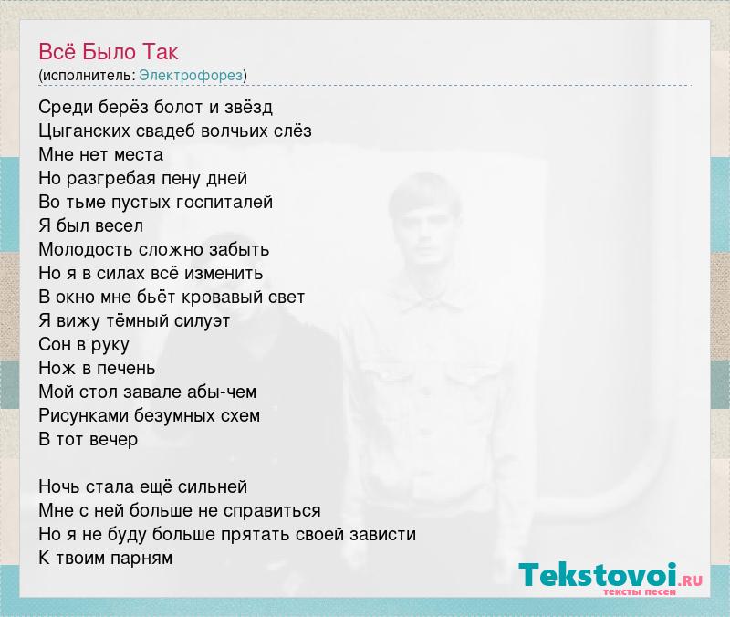 Среди берёз болот и звёзд Цыганских свадеб волчьих слёз Мне нет места Но разгребая пену дней Во тьме пустых госпиталей Я был весел Молодость сложно забыть Но я в силах всё изменить В окно мне бьёт кровавый свет Я вижу тёмный силуэт Сон в руку Нож в печень Мой стол завале абы-чем Рисунками безумных схем В тот вечер Ночь стала ещё сильней Мне с ней больше не справиться Но я не буду больше прятать своей зависти К твоим парням