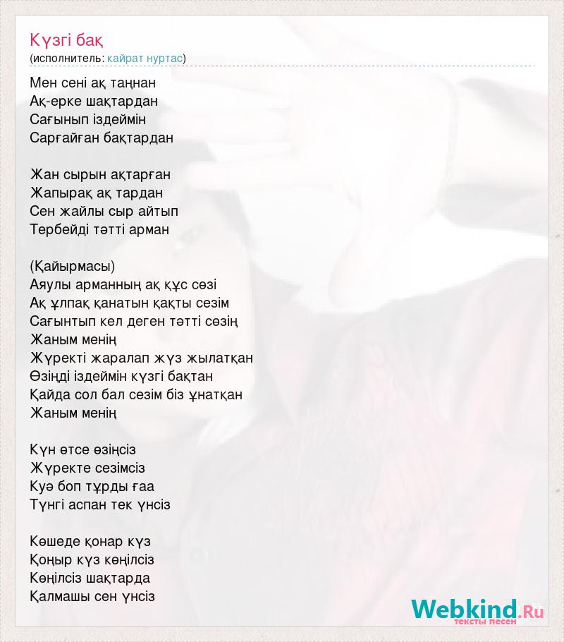 Мен сені ақ таңнан Ақ-ерке шақтардан Сағынып іздеймін Сарғайған бақтардан Жан сырын ақтарған Жапырақ ақ тардан Сен жайлы сыр айтып Тербейді тәтті арман (Қайырмасы) Аяулы арманның ақ құс сөзі Ақ ұлпақ қанатын қақты сезім Сағынтып кел деген тәтті сөзің Жаным менің Жүректі жаралап жүз жылатқан Өзіңді іздеймін күзгі бақтан Қайда сол бал сезім біз ұнатқан Жаным менің Күн өтсе өзіңсіз Жүректе сезімсіз Куә боп тұрды ғаа Түнгі аспан тек үнсіз Көшеде қонар күз Қоңыр күз көңілсіз Көңілсіз шақтарда Қалмашы сен үнсіз