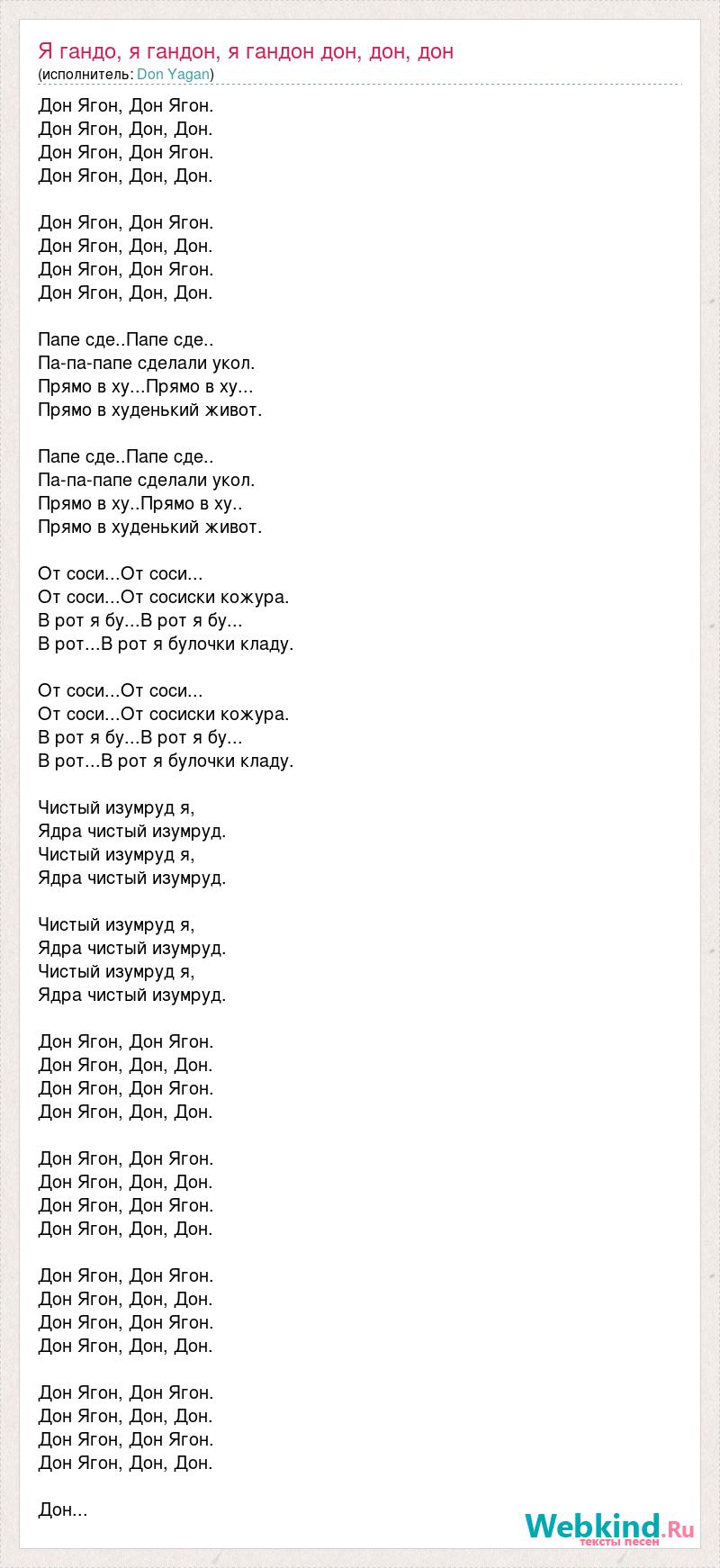 Дон Ягон, Дон Ягон. Дон Ягон, Дон, Дон. Дон Ягон, Дон Ягон. Дон Ягон, Дон, Дон. Дон Ягон, Дон Ягон. Дон Ягон, Дон, Дон. Дон Ягон, Дон Ягон. Дон Ягон, Дон, Дон. Папе сде..Папе сде.. Па-па-папе сделали укол. Прямо в ху...Прямо в ху... Прямо в худенький живот. Папе сде..Папе сде.. Па-па-папе сделали укол. Прямо в ху..Прямо в ху.. Прямо в худенький живот. От соси...От соси... От соси...От сосиски кожура. В рот я бу...В рот я бу... В рот...В рот я булочки кладу. От соси...От соси... От соси...От сосиски кожура. В рот я бу...В рот я бу... В рот...В рот я булочки кладу. Чистый изумруд я, Ядра чистый изумруд. Чистый изумруд я, Ядра чистый изумруд. Чистый изумруд я, Ядра чистый изумруд. Чистый изумруд я, Ядра чистый изумруд. Дон Ягон, Дон Ягон. Дон Ягон, Дон, Дон. Дон Ягон, Дон Ягон. Дон Ягон, Дон, Дон. Дон Ягон, Дон Ягон. Дон Ягон, Дон, Дон. Дон Ягон, Дон Ягон. Дон Ягон, Дон, Дон. Дон Ягон, Дон Ягон. Дон Ягон, Дон, Дон. Дон Ягон, Дон Ягон. Дон Ягон, Дон, Дон. Дон Ягон, Дон Ягон. Дон Ягон, Дон, Дон. Дон Ягон, Дон Ягон. Дон Ягон, Дон, Дон. Дон...