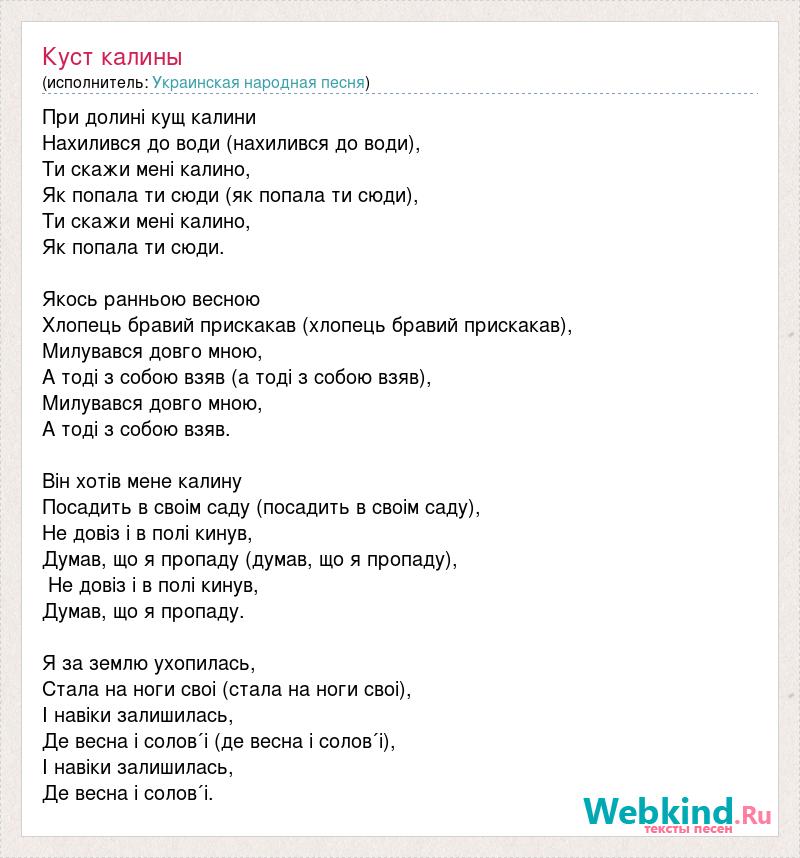 При долинi кущ калини Нахилився до води (нахилився до води), Ти скажи менi калино, Як попала ти сюди (як попала ти сюди), Ти скажи менi калино, Як попала ти сюди. Якось ранньою весною Хлопець бравий прискакав (хлопець бравий прискакав), Милувався довго мною, А тодi з собою взяв (а тодi з собою взяв), Милувався довго мною, А тодi з собою взяв. Вiн хотiв мене калину Посадить в своiм саду (посадить в своiм саду), Не довiз i в полi кинув, Думав, що я пропаду (думав, що я пропаду), Не довiз i в полi кинув, Думав, що я пропаду. Я за землю ухопилась, Стала на ноги своi (стала на ноги своi), I навiки залишилась, Де весна i солов´i (де весна i солов´i), I навiки залишилась, Де весна i солов´i.