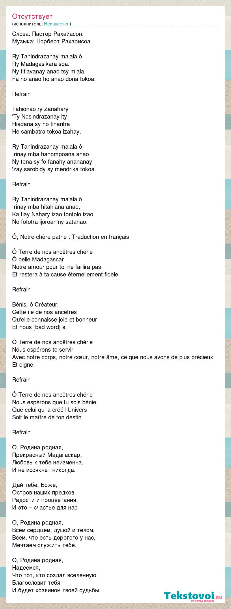 Слова: Пастор Рахайасон. Музыка: Норберт Рахарисоа. Ry Tanindrazanay malala ô Ry Madagasikara soa. Ny fitiavanay anao tsy miala, Fa ho anao ho anao doria tokoa. Refrain Tahionao ry Zanahary 'Ty Nosindrazanay ity Hiadana sy ho finaritra He sambatra tokoa izahay. Ry Tanindrazanay malala ô Irinay mba hanompoana anao Ny tena sy fo fanahy anananay 'zay sarobidy sy mendrika tokoa. Refrain Ry Tanindrazanay malala ô Irinay mba hitahiana anao, Ka Ilay Nahary izao tontolo izao No fototra ijoroan'ny satanao. Ô, Notre chère patrie : Traduction en français Ô Terre de nos ancêtres chérie Ô belle Madagascar Notre amour pour toi ne faillira pas Et restera à ta cause éternellement fidèle. Refrain Bénis, ô Créateur, Cette île de nos ancêtres Qu'elle connaisse joie et bonheur Et nous serons comblés. Ô Terre de nos ancêtres chérie Nous espérons te servir Avec notre corps, notre cœur, notre âme, ce que nous avons de plus précieux Et digne. Refrain Ô Terre de nos ancêtres chérie Nous espérons que tu sois bénie, Que celui qui a créé l'Univers Soit le maître de ton destin. Refrain О, Родина родная, Прекрасный Мадагаскар, Любовь к тебе неизменна. И не иссякнет никогда. Дай тебе, Боже, Остров наших предков, Радости и процветания, И это – счастье для нас О, Родина родная, Всем сердцем, душой и телом, Всем, что есть дорогого у нас, Мечтаем служить тебе. О, Родина родная, Надеемся, Что тот, кто создал вселенную Благословит тебя И будет хозяином твоей судьбы.