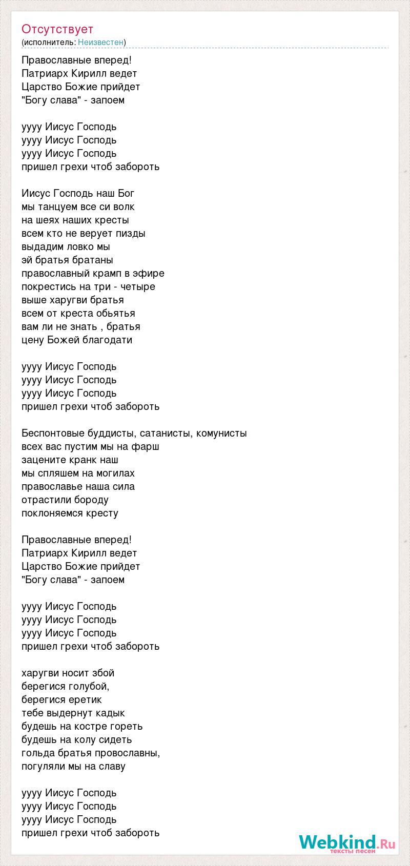 Православные вперед! Патриарх Кирилл ведет Царство Божие прийдет "Богу слава" - запоем уууу Иисус Господь уууу Иисус Господь уууу Иисус Господь пришел грехи чтоб забороть Иисус Господь наш Бог мы танцуем все си волк на шеях наших кресты всем кто не верует пизды выдадим ловко мы эй братья братаны православный крамп в эфире покрестись на три - четыре выше харугви братья всем от креста обьятья вам ли не знать , братья цену Божей благодати уууу Иисус Господь уууу Иисус Господь уууу Иисус Господь пришел грехи чтоб забороть Беспонтовые буддисты, сатанисты, комунисты всех вас пустим мы на фарш зацените кранк наш мы спляшем на могилах православье наша сила отрастили бороду поклоняемся кресту Православные вперед! Патриарх Кирилл ведет Царство Божие прийдет "Богу слава" - запоем уууу Иисус Господь уууу Иисус Господь уууу Иисус Господь пришел грехи чтоб забороть харугви носит збой берегися голубой, берегися еретик тебе выдернут кадык будешь на костре гореть будешь на колу сидеть гольда братья провославны, погуляли мы на славу уууу Иисус Господь уууу Иисус Господь уууу Иисус Господь пришел грехи чтоб забороть