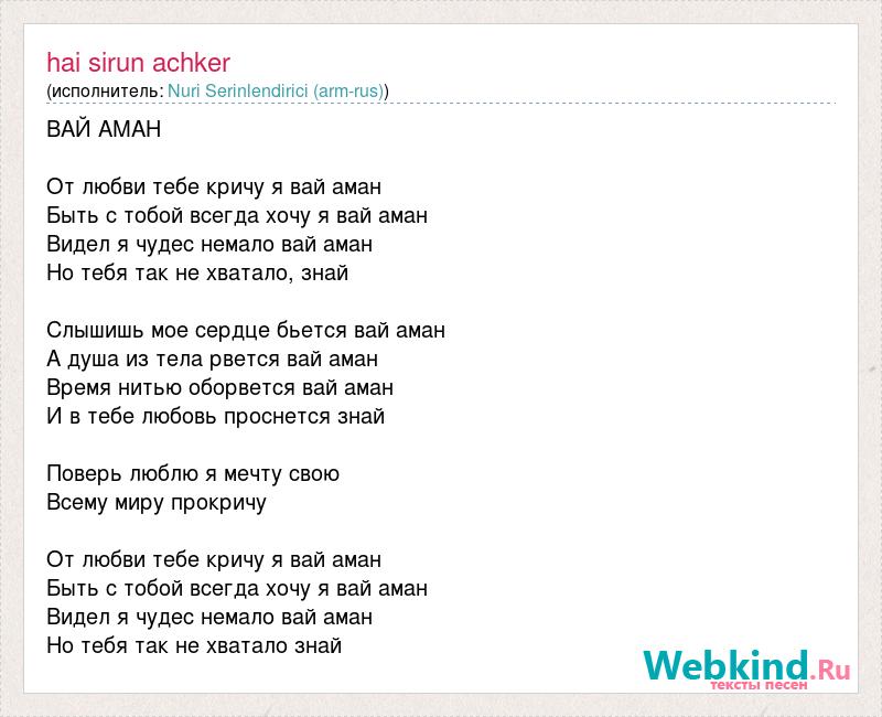 ВАЙ АМАН От любви тебе кричу я вай аман Быть с тобой всегда хочу я вай аман Видел я чудес немало вай аман Но тебя так не хватало, знай Слышишь мое сердце бьется вай аман А душа из тела рвется вай аман Время нитью оборвется вай аман И в тебе любовь проснется знай Поверь люблю я мечту свою Всему миру прокричу От любви тебе кричу я вай аман Быть с тобой всегда хочу я вай аман Видел я чудес немало вай аман Но тебя так не хватало знай