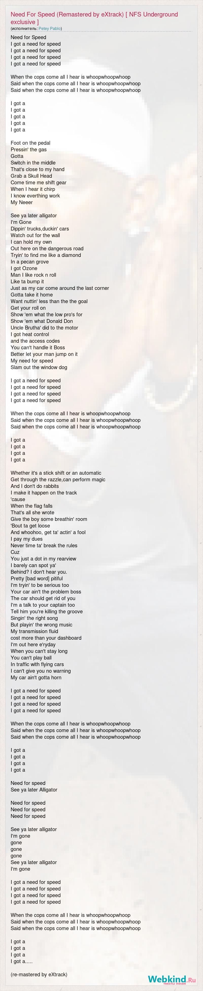 Need for Speed I got a need for speed I got a need for speed I got a need for speed I got a need for speed When the cops come all I hear is whoopwhoopwhoop Said when the cops come all I hear is whoopwhoopwhoop Said when the cops come all I hear is whoopwhoopwhoop I got a I got a I got a I got a I got a Foot on the pedal Pressin' the gas Gotta Switch in the middle That's close to my hand Grab a Skull Head Come time me shift gear When I hear it chirp I know everthing work My Neeer See ya later alligator I'm Gone Dippin' trucks,duckin' cars Watch out for the wall I can hold my own Out here on the dangerous road Tryin' to find me like a diamond In a pecan grove I got Ozone Man I like rock n roll Like ta bump it Just as my car come around the last corner Gotta take it home Want nuttin' less than the the goal Get your roll on Show 'em what the low pro's for Show 'em what Donald Don Uncle Brutha' did to the motor I got heat control and the access codes You can't handle it Boss Better let your man jump on it My need for speed Slam out the window dog I got a need for speed I got a need for speed I got a need for speed I got a need for speed When the cops come all I hear is whoopwhoopwhoop Said when the cops come all I hear is whoopwhoopwhoop Said when the cops come all I hear is whoopwhoopwhoop I got a I got a I got a I got a Whether it's a stick shift or an automatic Get through the razzle,can perform magic And I don't do rabbits I make it happen on the track 'cause When the flag falls That's all she wrote Give the boy some breathin' room 'Bout ta get loose And whoohoo, get ta' actin' a fool I pay my dues Never time ta' break the rules Cuz You just a dot in my rearview I barely can spot ya' Behind? I don't hear you. Pretty [bad word] pitiful I'm tryin' to be serious too Your car ain't the problem boss The car should get rid of you I'm a talk to your captain too Tell him you're killing the groove Singin' the right song But playin' the wrong music My transmission fluid cost more than your dashboard I'm out here e'ryday When you can't stay long You can't play ball In traffic with flying cars I can't give you no warning My car ain't gotta horn I got a need for speed I got a need for speed I got a need for speed I got a need for speed When the cops come all I hear is whoopwhoopwhoop Said when the cops come all I hear is whoopwhoopwhoop Said when the cops come all I hear is whoopwhoopwhoop I got a I got a I got a I got a Need for speed See ya later Alligator Need for speed Need for speed Need for speed See ya later alligator I'm gone gone gone gone See ya later alligator I'm gone I got a need for speed I got a need for speed I got a need for speed I got a need for speed When the cops come all I hear is whoopwhoopwhoop Said when the cops come all I hear is whoopwhoopwhoop Said when the cops come all I hear is whoopwhoopwhoop I got a I got a I got a I got a..... (re-mastered by eXtrack)