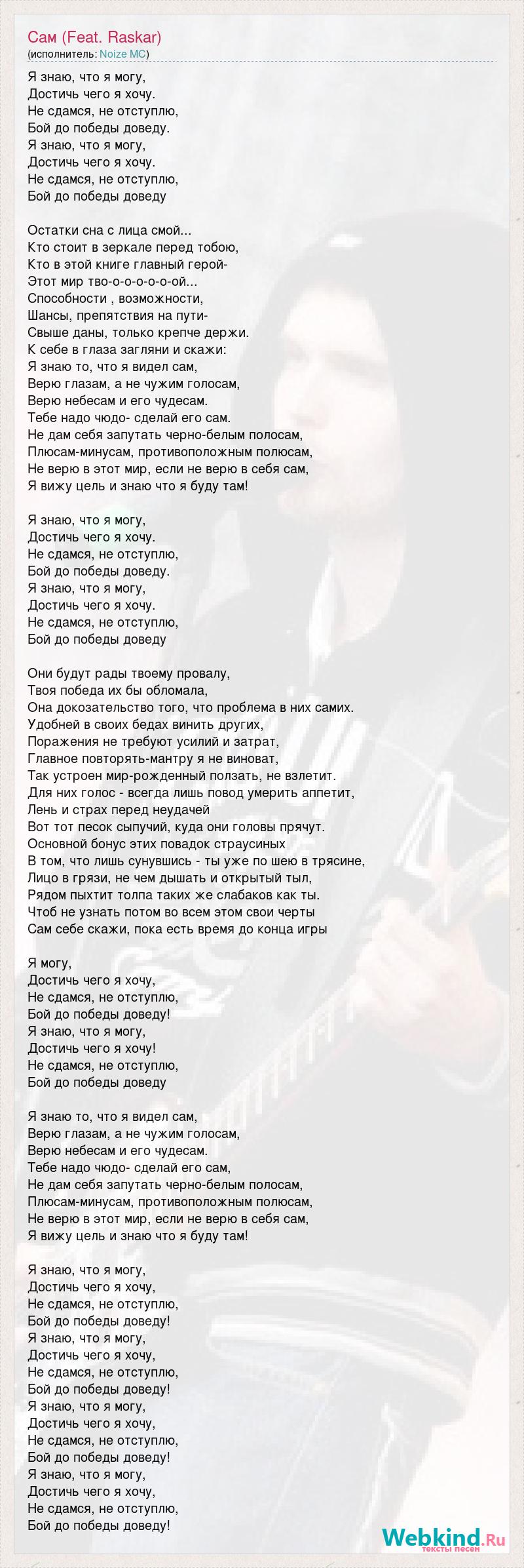 Я знаю, что я могу, Достичь чего я хочу. Не сдамся, не отступлю, Бой до победы доведу. Я знаю, что я могу, Достичь чего я хочу. Не сдамся, не отступлю, Бой до победы доведу Остатки сна с лица смой... Кто стоит в зеркале перед тобою, Кто в этой книге главный герой- Этот мир тво-о-о-о-о-о-ой... Способности , возможности, Шансы, препятствия на пути- Свыше даны, только крепче держи. К себе в глаза загляни и скажи: Я знаю то, что я видел сам, Верю глазам, а не чужим голосам, Верю небесам и его чудесам. Тебе надо чюдо- сделай его сам. Не дам себя запутать черно-белым полосам, Плюсам-минусам, противоположным полюсам, Не верю в этот мир, если не верю в себя сам, Я вижу цель и знаю что я буду там! Я знаю, что я могу, Достичь чего я хочу. Не сдамся, не отступлю, Бой до победы доведу. Я знаю, что я могу, Достичь чего я хочу. Не сдамся, не отступлю, Бой до победы доведу Они будут рады твоему провалу, Твоя победа их бы обломала, Она докозательство того, что проблема в них самих. Удобней в своих бедах винить других, Поражения не требуют усилий и затрат, Главное повторять-мантру я не виноват, Так устроен мир-рожденный ползать, не взлетит. Для них голос - всегда лишь повод умерить аппетит, Лень и страх перед неудачей Вот тот песок сыпучий, куда они головы прячут. Основной бонус этих повадок страусиных В том, что лишь сунувшись - ты уже по шею в трясине, Лицо в грязи, не чем дышать и открытый тыл, Рядом пыхтит толпа таких же слабаков как ты. Чтоб не узнать потом во всем этом свои черты Сам себе скажи, пока есть время до конца игры Я могу, Достичь чего я хочу, Не сдамся, не отступлю, Бой до победы доведу! Я знаю, что я могу, Достичь чего я хочу! Не сдамся, не отступлю, Бой до победы доведу Я знаю то, что я видел сам, Верю глазам, а не чужим голосам, Верю небесам и его чудесам. Тебе надо чюдо- сделай его сам, Не дам себя запутать черно-белым полосам, Плюсам-минусам, противоположным полюсам, Не верю в этот мир, если не верю в себя сам, Я вижу цель и знаю что я буду там! Я знаю, что я могу, Достичь чего я хочу, Не сдамся, не отступлю, Бой до победы доведу! Я знаю, что я могу, Достичь чего я хочу, Не сдамся, не отступлю, Бой до победы доведу! Я знаю, что я могу, Достичь чего я хочу, Не сдамся, не отступлю, Бой до победы доведу! Я знаю, что я могу, Достичь чего я хочу, Не сдамся, не отступлю, Бой до победы доведу!