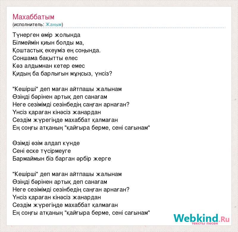 Түнерген өмір жолында Білмеймін қиын болды ма, Қоштастық екеуміз ең соңында. Соншама бақытты елес Көз алдымнан кетер емес Қидың ба барлығын мұңсыз, үнсіз? "Кешірші" деп маған айтпашы жалынам Өзіңді бәрінен артық деп санағам Неге сезімімді сезінбедің саңған арнаған? Үнсіз қараған кінәсіз жанардан Сездім жүрегіңде махаббат қалмаған Ең соңғы атқаның "қайғыра берме, сені сағынам" Өзімді өзім алдап күнде Сені еске түсірмеуге Бармаймын біз барган әрбір жерге "Кешірші" деп маған айтпашы жалынам Өзіңді бәрінен артық деп санағам Неге сезімімді сезінбедің саңған арнаған? Үнсіз қараған кінәсіз жанардан Сездім жүрегіңде махаббат қалмаған Ең соңғы атқаның "қайғыра берме, сені сағынам"