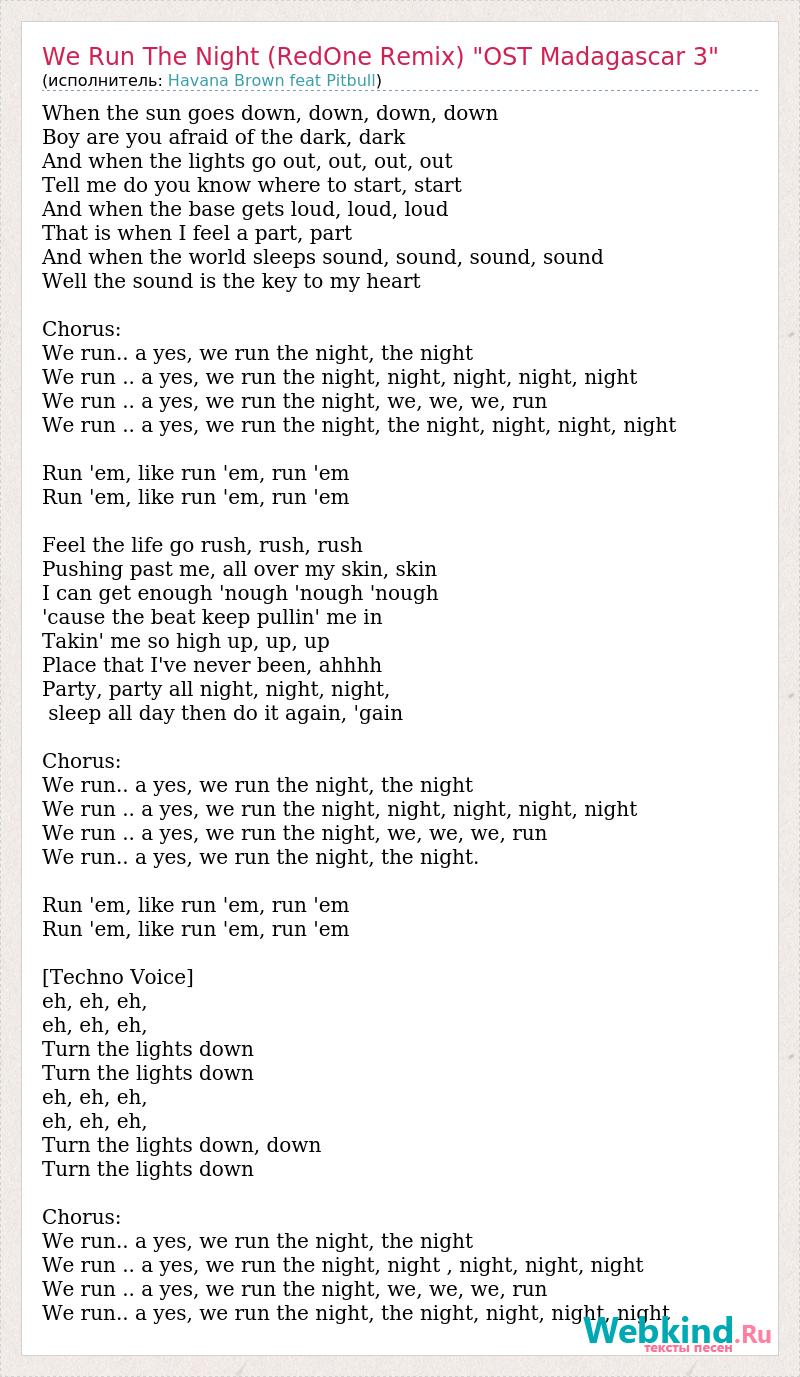 When the sun goes down, down, down, down Boy are you afraid of the dark, dark And when the lights go out, out, out, out Tell me do you know where to start, start And when the base gets loud, loud, loud That is when I feel a part, part And when the world sleeps sound, sound, sound, sound Well the sound is the key to my heart Chorus: We run.. a yes, we run the night, the night We run .. a yes, we run the night, night, night, night, night We run .. a yes, we run the night, we, we, we, run We run .. a yes, we run the night, the night, night, night, night Run 'em, like run 'em, run 'em Run 'em, like run 'em, run 'em Feel the life go rush, rush, rush Pushing past me, all over my skin, skin I can get enough 'nough 'nough 'nough 'cause the beat keep pullin' me in Takin' me so high up, up, up Place that I've never been, ahhhh Party, party all night, night, night, sleep all day then do it again, 'gain Chorus: We run.. a yes, we run the night, the night We run .. a yes, we run the night, night, night, night, night We run .. a yes, we run the night, we, we, we, run We run.. a yes, we run the night, the night. Run 'em, like run 'em, run 'em Run 'em, like run 'em, run 'em [Techno Voice] eh, eh, eh, eh, eh, eh, Turn the lights down Turn the lights down eh, eh, eh, eh, eh, eh, Turn the lights down, down Turn the lights down Chorus: We run.. a yes, we run the night, the night We run .. a yes, we run the night, night , night, night, night We run .. a yes, we run the night, we, we, we, run We run.. a yes, we run the night, the night, night, night, night