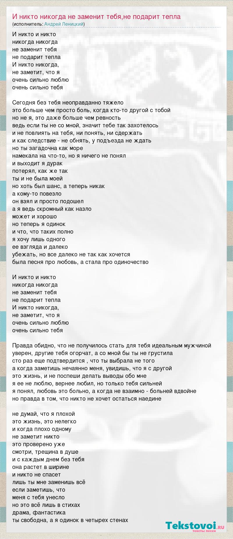 И никто и никто никогда никогда не заменит тебя не подарит тепла И никто никогда, не заметит, что я очень сильно люблю очень сильно тебя Сегодня без тебя неоправданно тяжело это больше чем просто боль, когда кто-то другой с тобой но не я, это даже больше чем ревность ведь если ты не со мной, значит тебе так захотелось и не повлиять на тебя, ни понять, ни сдержать и как следствие - не обнять, у подъезда не ждать но ты загадочна как море намекала на что-то, но я ничего не понял и выходит я дурак потерял, как же так ты и не была моей но хоть был шанс, а теперь никак а кому-то повезло он взял и просто подошел а я ведь скромный как назло может и хорошо но теперь я одинок и что, что таких полно я хочу лишь одного ее взгляда и далеко убежать, но все далеко не так как хочется была песня про любовь, а стала про одиночество И никто и никто никогда никогда не заменит тебя не подарит тепла И никто никогда, не заметит, что я очень сильно люблю очень сильно тебя Правда обидно, что не получилось стать для тебя идеальным мужчиной уверен, другие тебя огорчат, а со мной бы ты не грустила сто раз еще подтвердится , что ты выбрала не того а когда заметишь нечаянно меня, увидишь, что я с другой это жизнь, и не поспеши делать выводы обо мне я ее не люблю, вернее любил, но только тебя сильней я понял, любовь это больно, а когда не взаимно - больней вдвойне но правда в том, что никто не хочет остаться наедине не думай, что я плохой это жизнь, это нелегко и когда плохо одному не заметит никто это проверено уже смотри, трещина в душе и с каждым днем без тебя она растет в ширине и никто не спасет лишь ты мне заменишь всё если заметишь, что меня с тебя унесло но это всё лишь в стихах драма, фантастика ты свободна, а я одинок в четырех стенах
