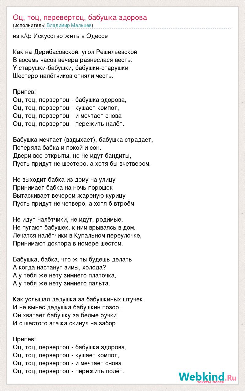 из к/ф Искусство жить в Одессе Как на Дерибасовской, угол Решильевской В восемь часов вечера разнеслася весть: У старушки-бабушки, бабушки-старушки Шестеро налётчиков отняли честь. Припев: Оц, тоц, первертоц - бабушка здорова, Оц, тоц, первертоц - кушает компот, Оц, тоц, первертоц - и мечтает снова Оц, тоц, первертоц - пережить налёт. Бабушка мечтает (вздыхает), бабушка страдает, Потеряла бабка и покой и сон. Двери все открыты, но не идут бандиты, Пусть придут не шестеро, а хотя бы вчетвером. Не выходит бабка из дому на улицу Принимает бабка на ночь порошок Вытаскивает вечером жареную курицу Пусть придут не четверо, а хотя б втроём Не идут налётчики, не идут, родимые, Не пугают бабушек, к ним врываясь в дом. Лечатся налётчики в Купальном переулочке, Принимают доктора в номере шестом. Бабушка, бабка, что ж ты будешь делать А когда настанут зимы, холода? А у тебя же нету зимнего платочка, А у тебя же нету зимнего пальта. Как услышал дедушка за бабушкиных штучек И не вынес дедушка бабушкин позор, Он хватает бабушку за белые ручки И с шестого этажа скинул на забор. Припев: Оц, тоц, первертоц - бабушка здорова, Оц, тоц, первертоц - кушает компот, Оц, тоц, первертоц - и мечтает снова Оц, тоц, первертоц - пережить полёт.