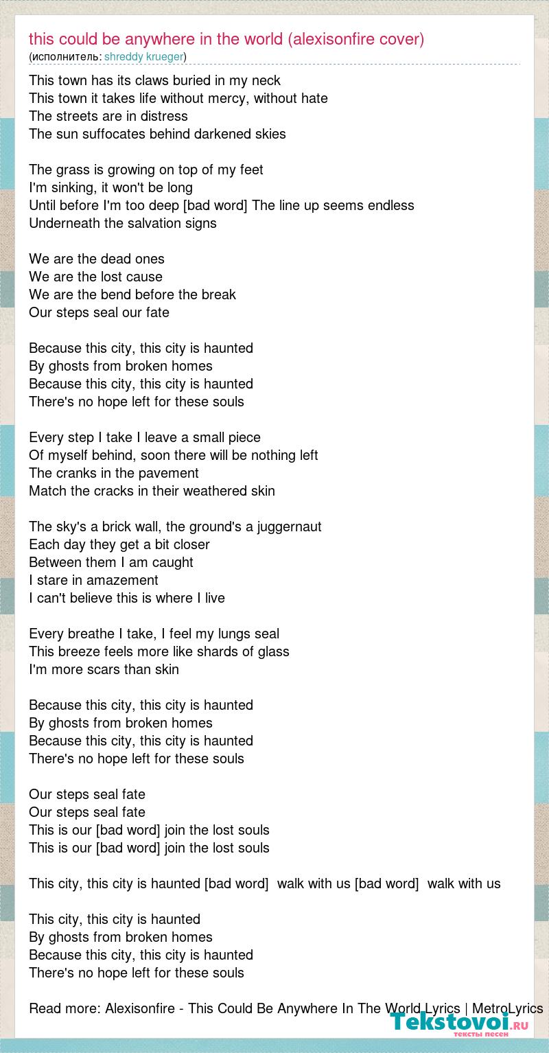 This town has its claws buried in my neck This town it takes life without mercy, without hate The streets are in distress The sun suffocates behind darkened skies The grass is growing on top of my feet I'm sinking, it won't be long Until before I'm too deep to run The line up seems endless Underneath the salvation signs We are the dead ones We are the lost cause We are the bend before the break Our steps seal our fate Because this city, this city is haunted By ghosts from broken homes Because this city, this city is haunted There's no hope left for these souls Every step I take I leave a small piece Of myself behind, soon there will be nothing left The cranks in the pavement Match the cracks in their weathered skin The sky's a brick wall, the ground's a juggernaut Each day they get a bit closer Between them I am caught I stare in amazement I can't believe this is where I live Every breathe I take, I feel my lungs seal This breeze feels more like shards of glass I'm more scars than skin Because this city, this city is haunted By ghosts from broken homes Because this city, this city is haunted There's no hope left for these souls Our steps seal fate Our steps seal fate This is our celebration, come join the lost souls This is our celebration, come join the lost souls This city, this city is haunted Come, walk with us all Come, walk with us This city, this city is haunted By ghosts from broken homes Because this city, this city is haunted There's no hope left for these souls Read more: Alexisonfire - This Could Be Anywhere In The World Lyrics | MetroLyrics