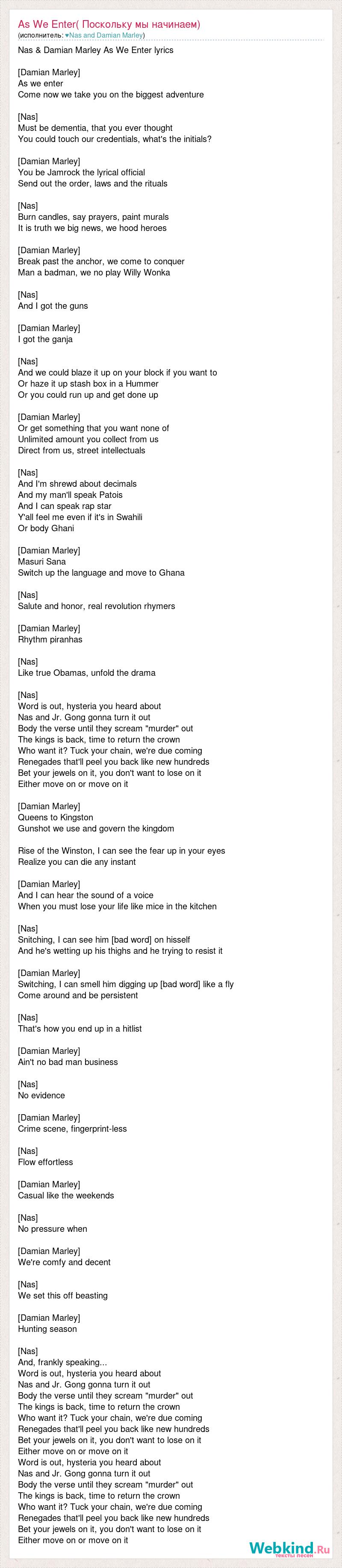Nas & Damian Marley As We Enter lyrics [Damian Marley] As we enter Come now we take you on the biggest adventure [Nas] Must be dementia, that you ever thought You could touch our credentials, what's the initials? [Damian Marley] You be Jamrock the lyrical official Send out the order, laws and the rituals [Nas] Burn candles, say prayers, paint murals It is truth we big news, we hood heroes [Damian Marley] Break past the anchor, we come to conquer Man a badman, we no play Willy Wonka [Nas] And I got the guns [Damian Marley] I got the ganja [Nas] And we could blaze it up on your block if you want to Or haze it up stash box in a Hummer Or you could run up and get done up [Damian Marley] Or get something that you want none of Unlimited amount you collect from us Direct from us, street intellectuals [Nas] And I'm shrewd about decimals And my man'll speak Patois And I can speak rap star Y'all feel me even if it's in Swahili Or body Ghani [Damian Marley] Masuri Sana Switch up the language and move to Ghana [Nas] Salute and honor, real revolution rhymers [Damian Marley] Rhythm piranhas [Nas] Like true Obamas, unfold the drama [Nas] Word is out, hysteria you heard about Nas and Jr. Gong gonna turn it out Body the verse until they scream "murder" out The kings is back, time to return the crown Who want it? Tuck your chain, we're due coming Renegades that'll peel you back like new hundreds Bet your jewels on it, you don't want to lose on it Either move on or move on it [Damian Marley] Queens to Kingston Gunshot we use and govern the kingdom Rise of the Winston, I can see the fear up in your eyes Realize you can die any instant [Damian Marley] And I can hear the sound of a voice When you must lose your life like mice in the kitchen [Nas] Snitching, I can see him [bad word] on hisself And he's wetting up his thighs and he trying to resist it [Damian Marley] Switching, I can smell him digging up [bad word] like a fly Come around and be persistent [Nas] That's how you end up in a hitlist [Damian Marley] Ain't no bad man business [Nas] No evidence [Damian Marley] Crime scene, fingerprint-less [Nas] Flow effortless [Damian Marley] Casual like the weekends [Nas] No pressure when [Damian Marley] We're comfy and decent [Nas] We set this off beasting [Damian Marley] Hunting season [Nas] And, frankly speaking... Word is out, hysteria you heard about Nas and Jr. Gong gonna turn it out Body the verse until they scream "murder" out The kings is back, time to return the crown Who want it? Tuck your chain, we're due coming Renegades that'll peel you back like new hundreds Bet your jewels on it, you don't want to lose on it Either move on or move on it Word is out, hysteria you heard about Nas and Jr. Gong gonna turn it out Body the verse until they scream "murder" out The kings is back, time to return the crown Who want it? Tuck your chain, we're due coming Renegades that'll peel you back like new hundreds Bet your jewels on it, you don't want to lose on it Either move on or move on it