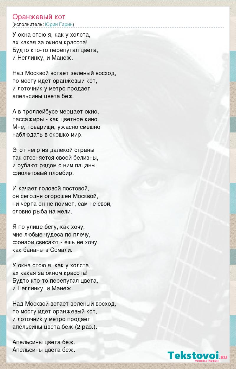 У окна стою я, как у холста, ах какая за окном красота! Будто кто-то перепутал цвета, и Неглинку, и Манеж. Над Москвой встает зеленый восход, по мосту идет оранжевый кот, и лоточник у метро продает апельсины цвета беж. А в троллейбусе мерцает окно, пассажиры - как цветное кино. Мне, товарищи, ужасно смешно наблюдать в окошко мир. Этот негр из далекой страны так стесняется своей белизны, и рубают рядом с ним пацаны фиолетовый пломбир. И качает головой постовой, он сегодня огорошен Москвой, ни черта он не поймет, сам не свой, словно рыба на мели. Я по улице бегу, как хочу, мне любые чудеса по плечу, фонари свисают - ешь не хочу, как бананы в Сомали. У окна стою я, как у холста, ах какая за окном красота! Будто кто-то перепутал цвета, и Неглинку, и Манеж. Над Москвой встает зеленый восход, по мосту идет оранжевый кот, и лоточник у метро продает апельсины цвета беж (2 раз.). Апельсины цвета беж. Апельсины цвета беж.