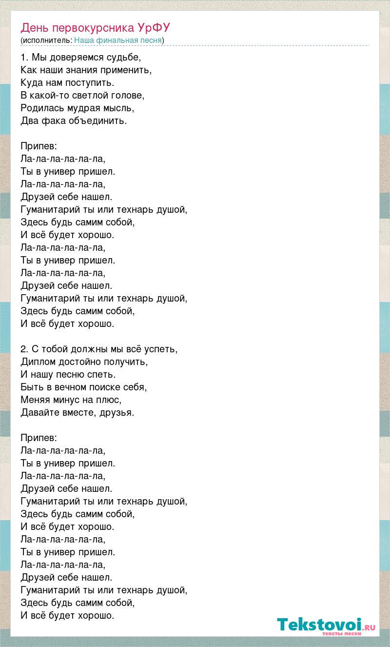 1. Мы доверяемся судьбе, Как наши знания применить, Куда нам поступить. В какой-то светлой голове, Родилась мудрая мысль, Два фака объединить. Припев: Ла-ла-ла-ла-ла-ла, Ты в универ пришел. Ла-ла-ла-ла-ла-ла, Друзей себе нашел. Гуманитарий ты или технарь душой, Здесь будь самим собой, И всё будет хорошо. Ла-ла-ла-ла-ла-ла, Ты в универ пришел. Ла-ла-ла-ла-ла-ла, Друзей себе нашел. Гуманитарий ты или технарь душой, Здесь будь самим собой, И всё будет хорошо. 2. С тобой должны мы всё успеть, Диплом достойно получить, И нашу песню спеть. Быть в вечном поиске себя, Меняя минус на плюс, Давайте вместе, друзья. Припев: Ла-ла-ла-ла-ла-ла, Ты в универ пришел. Ла-ла-ла-ла-ла-ла, Друзей себе нашел. Гуманитарий ты или технарь душой, Здесь будь самим собой, И всё будет хорошо. Ла-ла-ла-ла-ла-ла, Ты в универ пришел. Ла-ла-ла-ла-ла-ла, Друзей себе нашел. Гуманитарий ты или технарь душой, Здесь будь самим собой, И всё будет хорошо.