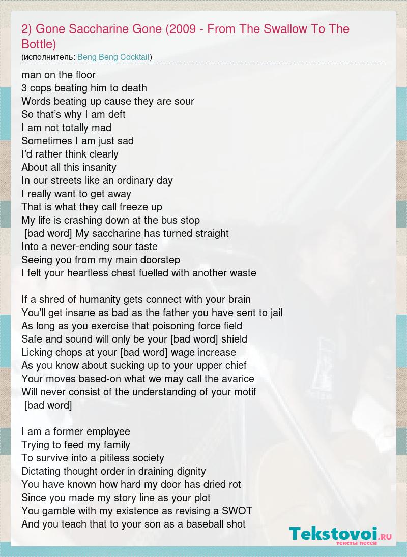 Главная→Исполнители→Beng Beng Cocktail→2) Gone Saccharine Gone (2009 - From The Swallow To The Bottle)