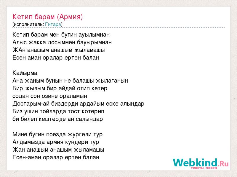 Кетип барам мен бугин ауылымнан Алыс жакка досыммен бауырымнан ЖАн анашым анашым жыламашы Есен аман оралар ертен балан Кайырма Ана жаным бунын не балашы жылаганын Бир жылым бир айдай отип кетер содан сон озине ораламын Достарым-ай биздерди ардайым еске алындар Биз ушин тойларда тост котерип би билеп кештерде ан салындар Мине бугин поезда жургели тур Алдымызда армия кундери тур Жан анашым анашым жыламашы Есен-аман оралар ертен балан