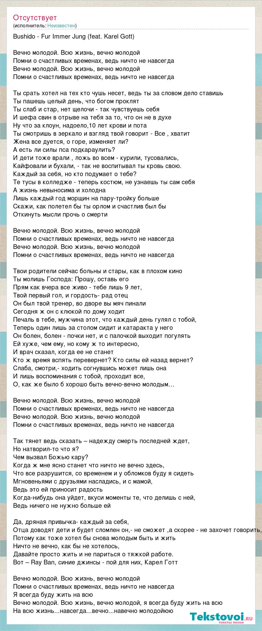 Bushido - Fur Immer Jung (feat. Karel Gott) Вечно молодой. Всю жизнь, вечно молодой Помни о счастливых временах, ведь ничто не навсегда Вечно молодой. Всю жизнь, вечно молодой Помни о счастливых временах, ведь ничто не навсегда Ты срать хотел на тех кто чушь несет, ведь ты за словом дело ставишь Ты пашешь целый день, что богом проклят Ты слаб и стар, нет щелочи - так чувствуешь себя И шефа свин в отрыве на тебя за то, что он не в духе Ну что за клоун, надоело,10 лет крови и пота Ты смотришь в зеркало и взгляд твой говорит - Все , хватит Жена все дуется, о горе, изменяет ли? А есть ли силы пса подкараулить? И дети тоже врали , ложь во всем - курили, тусовались, Кайфовали и бухали, - так не воспитывал ты кровь свою. Каждый за се6я, но кто подумает о тебе? Те тусы в колледже - теперь костюм, не узнаешь ты сам себя А жизнь невыносима и холодна Лишь каждый год морщин на пару-тройку больше Скажи, как полетел бы ты орлом и счастлив был бы Откинуть мысли прочь о смерти Вечно молодой. Всю жизнь, вечно молодой Помни о счастливых временах, ведь ничто не навсегда Вечно молодой. Всю жизнь, вечно молодой Помни о счастливых временах, ведь ничто не навсегда Твои родители сейчас больны и стары, как в плохом кино Ты молишь Господа: Прошу, оставь его Прям как вчера все живо - тебе лишь 9 лет, Твой первый гол, и гордость- рад отец Он был твой тренер, во дворе вы мяч пинали Сегодня ж он с клюкой по дому ходит Печаль в тебе, мужчина этот, что каждый день гулял с тобой, Теперь один лишь за столом сидит и катаракта у него Он болен, болен - почки нет, и с палочкой выходит погулять Ей хуже, чем ему, но кому ж то интересно, И врач сказал, когда ее не станет Кто ж время вспять перевернет? Кто силы ей назад вернет? Слаба, смотри,- ходить согнувшись может лишь она И лишь воспоминания с тобой, проходит все, О, как же было б хорошо быть вечно-вечно молодым… Вечно молодой. Всю жизнь, вечно молодой Помни о счастливых временах, ведь ничто не навсегда Вечно молодой. Всю жизнь, вечно молодой Помни о счастливых временах, ведь ничто не навсегда Так тянет ведь сказать – надежду смерть последней ждет, Но натворил-то что я? Чем вызвал Божью кару? Когда ж мне ясно станет что ничто не вечно здесь, Что все разрушится, со временем и у обломков буду я сидеть Мгновеньями с друзьями насладись, и с мамой, Ведь это ей приносит радость Когда-нибудь она уйдет, вкуси моменты те, что делишь с ней, Ведь ничего не нужно больше ей Да, дряная привычка- каждый за себя, Отца доводят дети и будет сломлен он,- не сможет ,а скорее - не захочет говорить, Потому как тоже хотел бы снова молодым быть и жить Ничто не вечно, как бы не хотелось, Давайте просто жить и не париться о тяжкой работе. Вот – Ray Ban, синие джинсы - пой для них, Карел Готт Вечно молодой. Всю жизнь, вечно молодой Помни о счастливых временах, ведь ничто не навсегда Я всегда буду жить на всю Вечно молодой. Всю жизнь, вечно молодой, я всегда буду жить на всю На всю жизнь...навсегда...вечно...навечно молодойюю