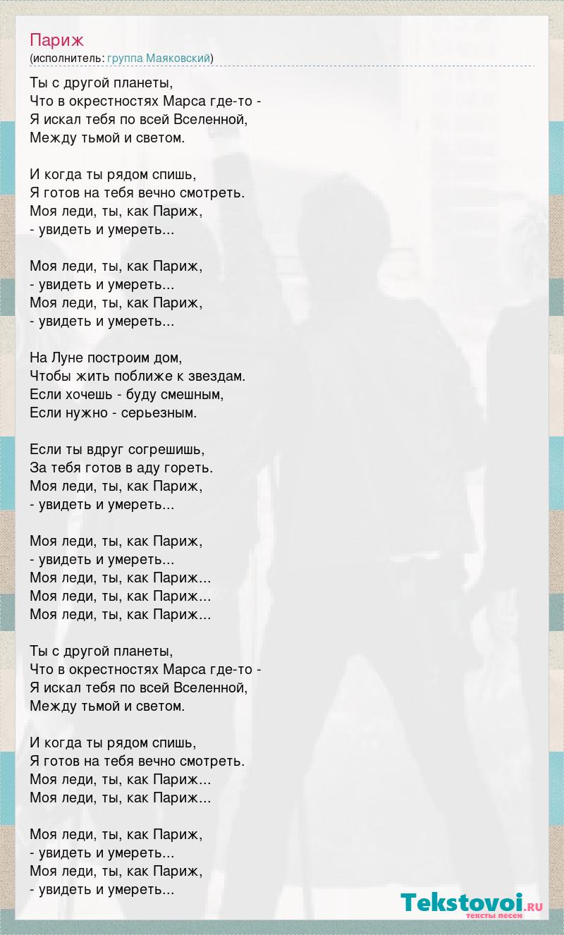 Ты с другой планеты, Что в окрестностях Марса где-то - Я искал тебя по всей Вселенной, Между тьмой и светом. И когда ты рядом спишь, Я готов на тебя вечно смотреть. Моя леди, ты, как Париж, - увидеть и умереть... Моя леди, ты, как Париж, - увидеть и умереть... Моя леди, ты, как Париж, - увидеть и умереть... На Луне построим дом, Чтобы жить поближе к звездам. Если хочешь - буду смешным, Если нужно - серьезным. Если ты вдруг согрешишь, За тебя готов в аду гореть. Моя леди, ты, как Париж, - увидеть и умереть... Моя леди, ты, как Париж, - увидеть и умереть... Моя леди, ты, как Париж... Моя леди, ты, как Париж... Моя леди, ты, как Париж... Ты с другой планеты, Что в окрестностях Марса где-то - Я искал тебя по всей Вселенной, Между тьмой и светом. И когда ты рядом спишь, Я готов на тебя вечно смотреть. Моя леди, ты, как Париж... Моя леди, ты, как Париж... Моя леди, ты, как Париж, - увидеть и умереть... Моя леди, ты, как Париж, - увидеть и умереть...