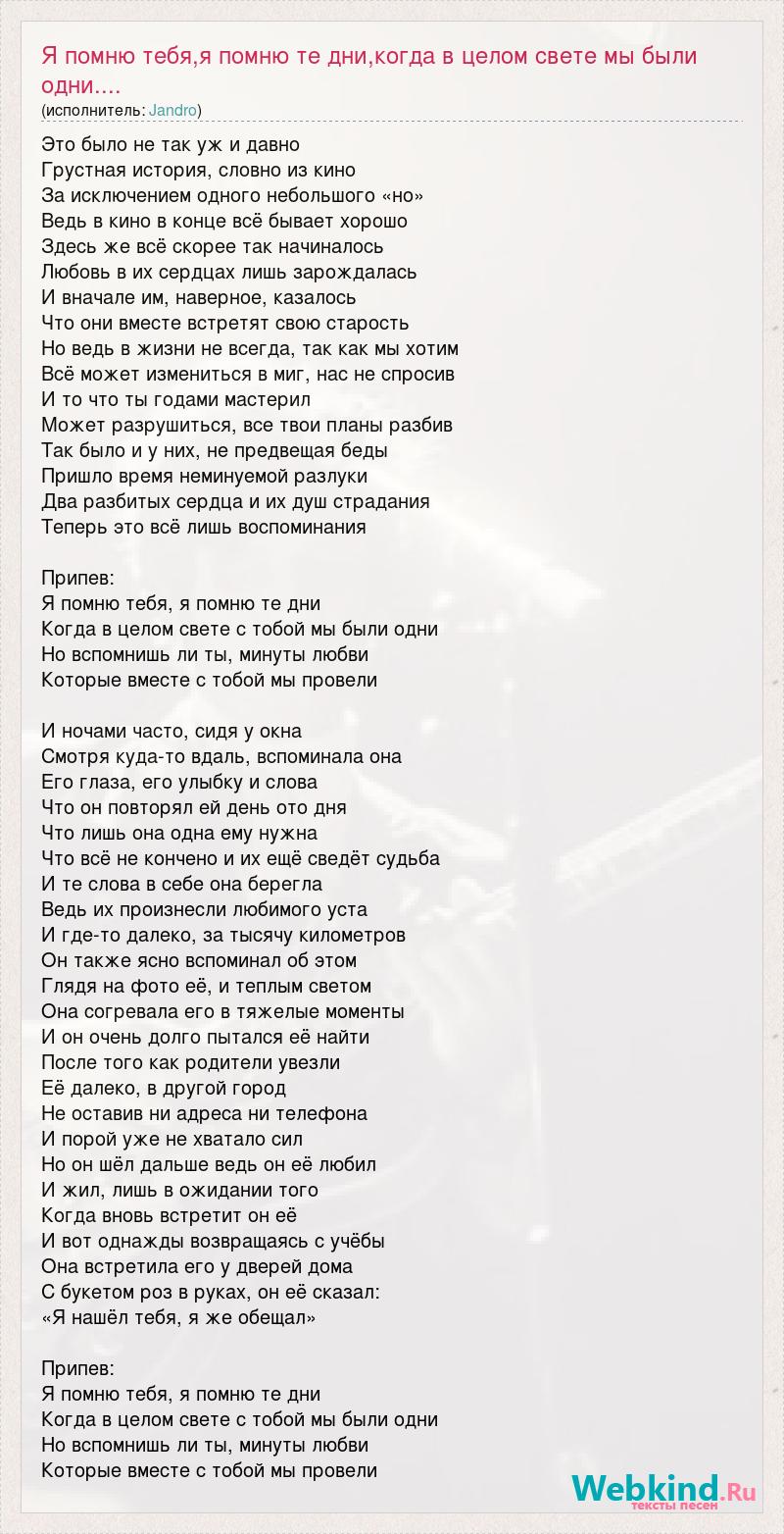 Это было не так уж и давно Грустная история, словно из кино За исключением одного небольшого «но» Ведь в кино в конце всё бывает хорошо Здесь же всё скорее так начиналось Любовь в их сердцах лишь зарождалась И вначале им, наверное, казалось Что они вместе встретят свою старость Но ведь в жизни не всегда, так как мы хотим Всё может измениться в миг, нас не спросив И то что ты годами мастерил Может разрушиться, все твои планы разбив Так было и у них, не предвещая беды Пришло время неминуемой разлуки Два разбитых сердца и их душ страдания Теперь это всё лишь воспоминания Припев: Я помню тебя, я помню те дни Когда в целом свете с тобой мы были одни Но вспомнишь ли ты, минуты любви Которые вместе с тобой мы провели И ночами часто, сидя у окна Смотря куда-то вдаль, вспоминала она Его глаза, его улыбку и слова Что он повторял ей день ото дня Что лишь она одна ему нужна Что всё не кончено и их ещё сведёт судьба И те слова в себе она берегла Ведь их произнесли любимого уста И где-то далеко, за тысячу километров Он также ясно вспоминал об этом Глядя на фото её, и теплым светом Она согревала его в тяжелые моменты И он очень долго пытался её найти После того как родители увезли Её далеко, в другой город Не оставив ни адреса ни телефона И порой уже не хватало сил Но он шёл дальше ведь он её любил И жил, лишь в ожидании того Когда вновь встретит он её И вот однажды возвращаясь с учёбы Она встретила его у дверей дома С букетом роз в руках, он её сказал: «Я нашёл тебя, я же обещал» Припев: Я помню тебя, я помню те дни Когда в целом свете с тобой мы были одни Но вспомнишь ли ты, минуты любви Которые вместе с тобой мы провели