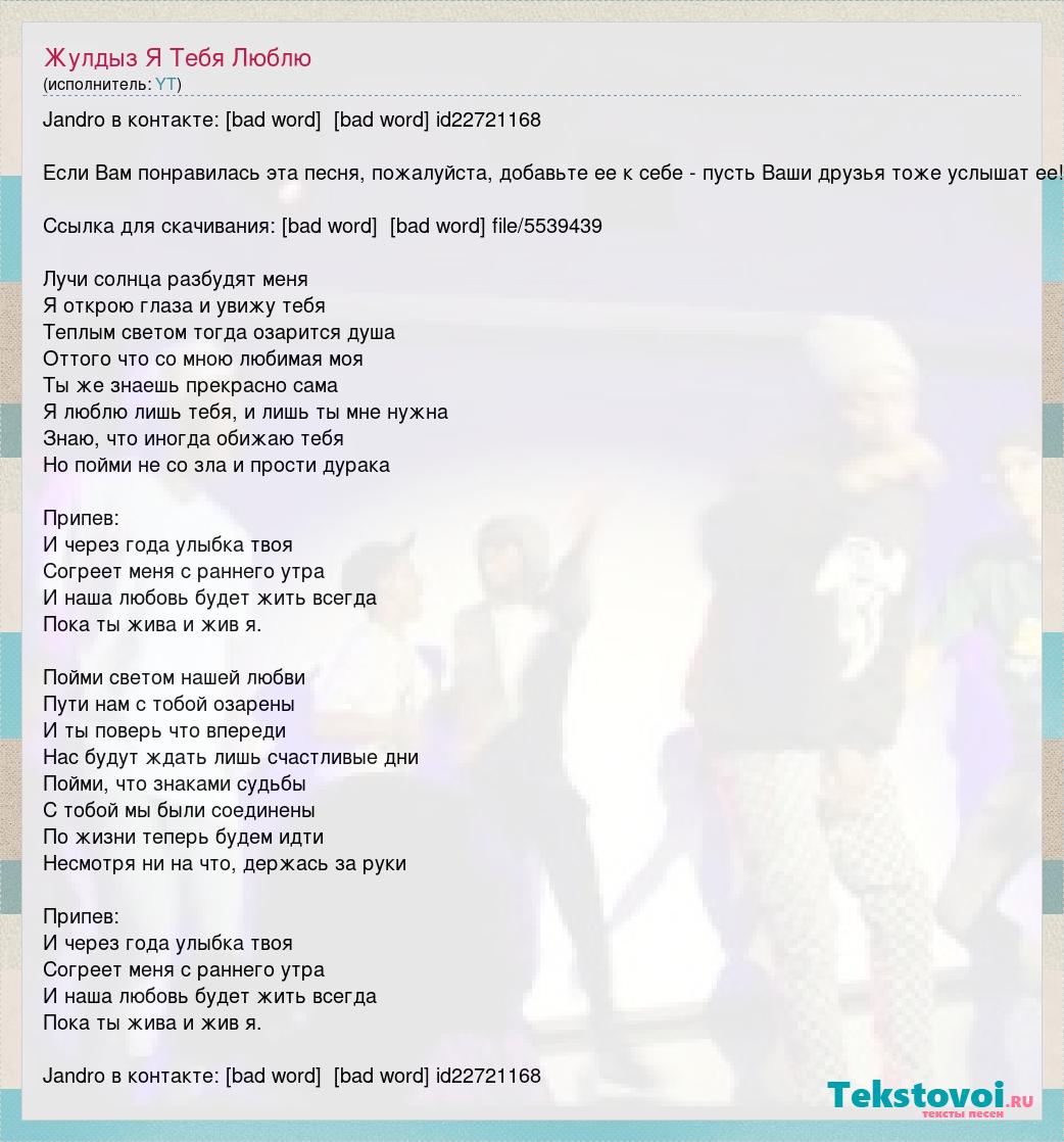 Jandro в контакте: [bad word] [bad word] id22721168 Если Вам понравилась эта песня, пожалуйста, добавьте ее к себе - пусть Ваши друзья тоже услышат ее! Ссылка для скачивания: [bad word] [bad word] file/5539439 Лучи солнца разбудят меня Я открою глаза и увижу тебя Теплым светом тогда озарится душа Оттого что со мною любимая моя Ты же знаешь прекрасно сама Я люблю лишь тебя, и лишь ты мне нужна Знаю, что иногда обижаю тебя Но пойми не со зла и прости дурака Припев: И через года улыбка твоя Согреет меня с раннего утра И наша любовь будет жить всегда Пока ты жива и жив я. Пойми светом нашей любви Пути нам с тобой озарены И ты поверь что впереди Нас будут ждать лишь счастливые дни Пойми, что знаками судьбы С тобой мы были соединены По жизни теперь будем идти Несмотря ни на что, держась за руки Припев: И через года улыбка твоя Согреет меня с раннего утра И наша любовь будет жить всегда Пока ты жива и жив я. Jandro в контакте: [bad word] [bad word] id22721168