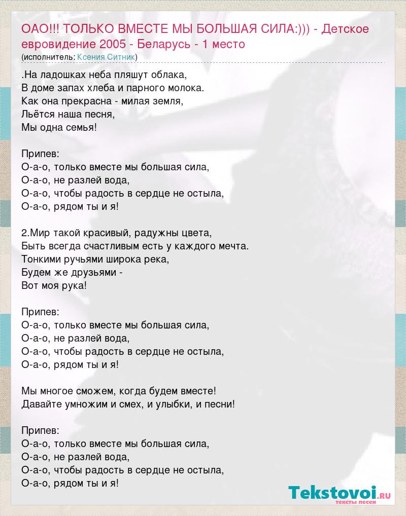 .На ладошках неба пляшут облака, В доме запах хлеба и парного молока. Как она прекрасна - милая земля, Льётся наша песня, Мы одна семья! Припев: О-а-о, только вместе мы большая сила, О-а-о, не разлей вода, О-а-о, чтобы радость в сердце не остыла, О-а-о, рядом ты и я! 2.Мир такой красивый, радужны цвета, Быть всегда счастливым есть у каждого мечта. Тонкими ручьями широка река, Будем же друзьями - Вот моя рука! Припев: О-а-о, только вместе мы большая сила, О-а-о, не разлей вода, О-а-о, чтобы радость в сердце не остыла, О-а-о, рядом ты и я! Мы многое сможем, когда будем вместе! Давайте умножим и смех, и улыбки, и песни! Припев: О-а-о, только вместе мы большая сила, О-а-о, не разлей вода, О-а-о, чтобы радость в сердце не остыла, О-а-о, рядом ты и я!