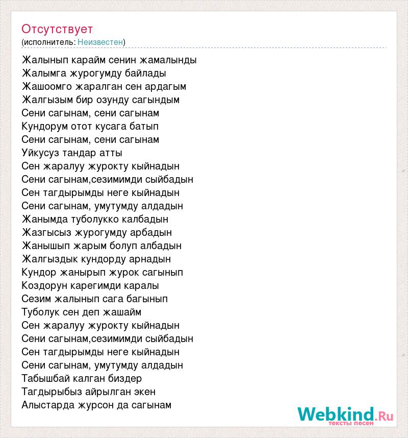 Жалынып карайм сенин жамалынды Жалымга журогумду байлады Жашоомго жаралган сен ардагым Жалгызым бир озунду сагындым Сени сагынам, сени сагынам Кундорум отот кусага батып Сени сагынам, сени сагынам Уйкусуз тандар атты Сен жаралуу журокту кыйнадын Сени сагынам,сезимимди сыйбадын Сен тагдырымды неге кыйнадын Сени сагынам, умутумду алдадын Жанымда туболукко калбадын Жазгысыз журогумду арбадын Жанышып жарым болуп албадын Жалгыздык кундорду арнадын Кундор жанырып журок сагынып Коздорун карегимди каралы Сезим жалынып сага багынып Туболук сен деп жашайм Сен жаралуу журокту кыйнадын Сени сагынам,сезимимди сыйбадын Сен тагдырымды неге кыйнадын Сени сагынам, умутумду алдадын Табышбай калган биздер Тагдырыбыз айрылган экен Алыстарда журсон да сагынам