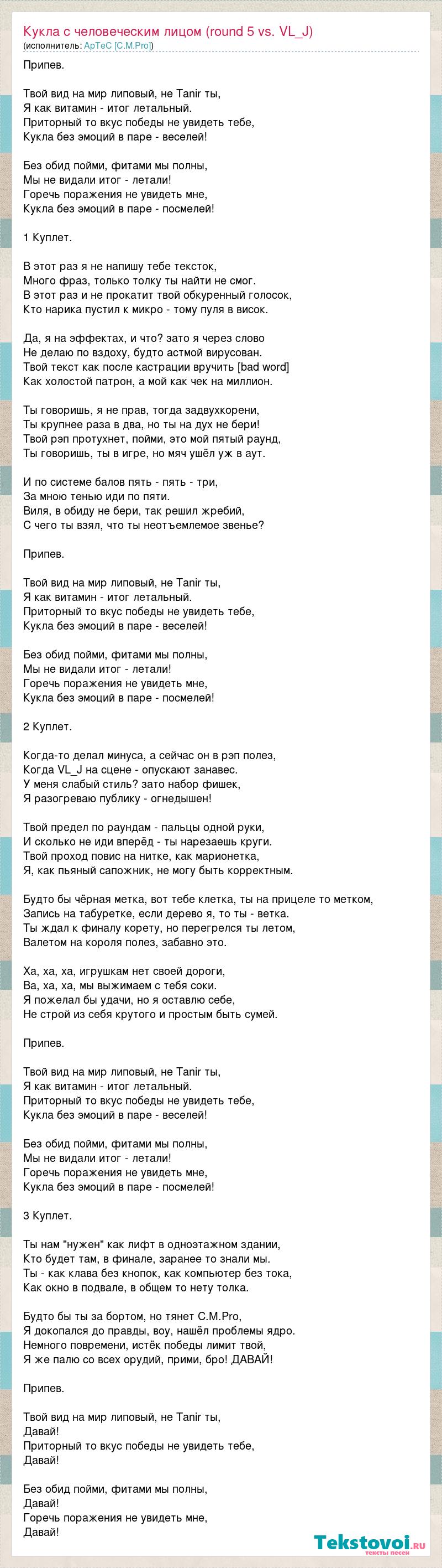Припев. Твой вид на мир липовый, не Tanir ты, Я как витамин - итог летальный. Приторный то вкус победы не увидеть тебе, Кукла без эмоций в паре - веселей! Без обид пойми, фитами мы полны, Мы не видали итог - летали! Горечь поражения не увидеть мне, Кукла без эмоций в паре - посмелей! 1 Куплет. В этот раз я не напишу тебе тексток, Много фраз, только толку ты найти не смог. В этот раз и не прокатит твой обкуренный голосок, Кто нарика пустил к микро - тому пуля в висок. Да, я на эффектах, и что? зато я через слово Не делаю по вздоху, будто астмой вирусован. Твой текст как после кастрации вручить [bad word] Как холостой патрон, а мой как чек на миллион. Ты говоришь, я не прав, тогда задвухкорени, Ты крупнее раза в два, но ты на дух не бери! Твой рэп протухнет, пойми, это мой пятый раунд, Ты говоришь, ты в игре, но мяч ушёл уж в аут. И по системе балов пять - пять - три, За мною тенью иди по пяти. Виля, в обиду не бери, так решил жребий, С чего ты взял, что ты неотъемлемое звенье? Припев. Твой вид на мир липовый, не Tanir ты, Я как витамин - итог летальный. Приторный то вкус победы не увидеть тебе, Кукла без эмоций в паре - веселей! Без обид пойми, фитами мы полны, Мы не видали итог - летали! Горечь поражения не увидеть мне, Кукла без эмоций в паре - посмелей! 2 Куплет. Когда-то делал минуса, а сейчас он в рэп полез, Когда VL_J на сцене - опускают занавес. У меня слабый стиль? зато набор фишек, Я разогреваю публику - огнедышен! Твой предел по раундам - пальцы одной руки, И сколько не иди вперёд - ты нарезаешь круги. Твой проход повис на нитке, как марионетка, Я, как пьяный сапожник, не могу быть корректным. Будто бы чёрная метка, вот тебе клетка, ты на прицеле то метком, Запись на табуретке, если дерево я, то ты - ветка. Ты ждал к финалу корету, но перегрелся ты летом, Валетом на короля полез, забавно это. Ха, ха, ха, игрушкам нет своей дороги, Ва, ха, ха, мы выжимаем с тебя соки. Я пожелал бы удачи, но я оставлю себе, Не строй из себя крутого и простым быть сумей. Припев. Твой вид на мир липовый, не Tanir ты, Я как витамин - итог летальный. Приторный то вкус победы не увидеть тебе, Кукла без эмоций в паре - веселей! Без обид пойми, фитами мы полны, Мы не видали итог - летали! Горечь поражения не увидеть мне, Кукла без эмоций в паре - посмелей! 3 Куплет. Ты нам "нужен" как лифт в одноэтажном здании, Кто будет там, в финале, заранее то знали мы. Ты - как клава без кнопок, как компьютер без тока, Как окно в подвале, в общем то нету толка. Будто бы ты за бортом, но тянет C.M.Pro, Я докопался до правды, воу, нашёл проблемы ядро. Немного повремени, истёк победы лимит твой, Я же палю со всех орудий, прими, бро! ДАВАЙ! Припев. Твой вид на мир липовый, не Tanir ты, Давай! Приторный то вкус победы не увидеть тебе, Давай! Без обид пойми, фитами мы полны, Давай! Горечь поражения не увидеть мне, Давай!