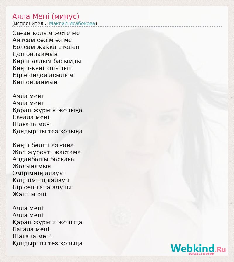 Саған қолым жете ме Айтсам сөзiм өзiме Болсам жаққа етелеп Деп ойлаймын Көріп алдым басымды Көңiл-күйi ашылып Бiр өзiңдей асылым Көп ойлаймын Аяла менi Аяла менi Қарап жүрмiн жолыңа Бағала менi Шағала менi Қондыршы тез қолыңа Көңіл бөлшi аз ғана Жас жүректi жастама Алданбашы басқаға Жалынамын Өмiрiмнiң алауы Көңiлiмнiң қалауы Бір сен ғана аяулы Жаным әнi Аяла менi Аяла менi Қарап жүрмiн жолыңа Бағала менi Шағала менi Қондыршы тез қолыңа
