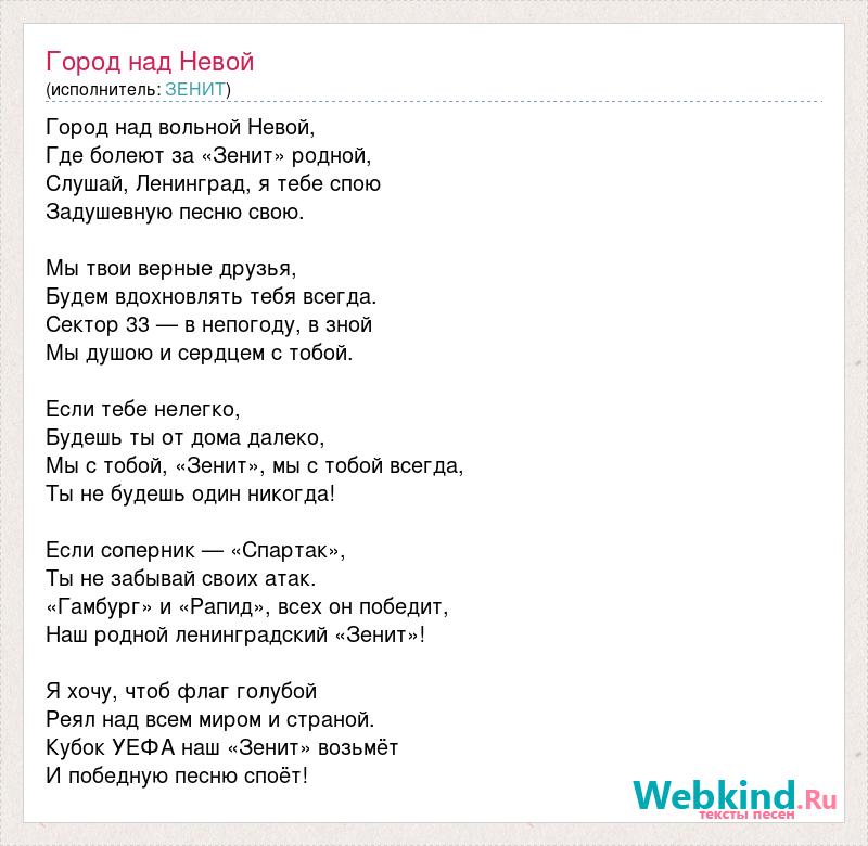 Город над вольной Невой, Где болеют за «Зенит» родной, Слушай, Ленинград, я тебе спою Задушевную песню свою. Мы твои верные друзья, Будем вдохновлять тебя всегда. Сектор 33 — в непогоду, в зной Мы душою и сердцем с тобой. Если тебе нелегко, Будешь ты от дома далеко, Мы с тобой, «Зенит», мы с тобой всегда, Ты не будешь один никогда! Если соперник — «Спартак», Ты не забывай своих атак. «Гамбург» и «Рапид», всех он победит, Наш родной ленинградский «Зенит»! Я хочу, чтоб флаг голубой Реял над всем миром и страной. Кубок УЕФА наш «Зенит» возьмёт И победную песню споёт!