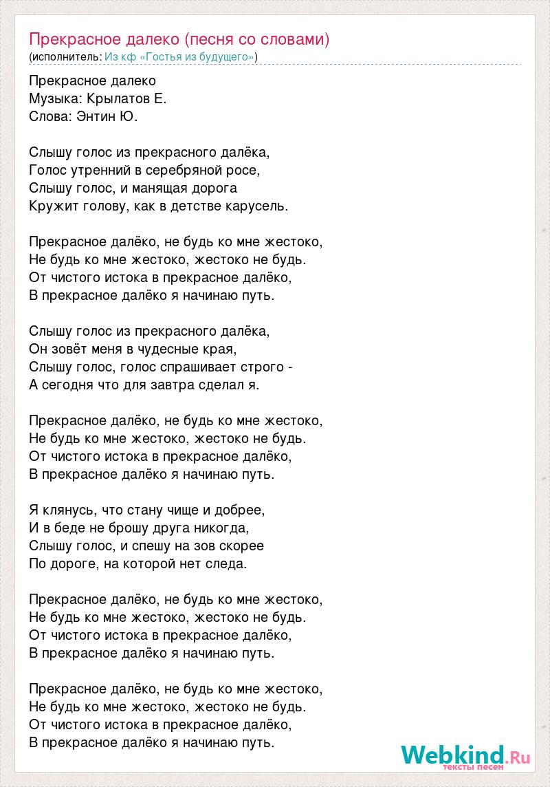 Прекрасное далеко Музыка: Крылатов Е. Слова: Энтин Ю. Слышу голос из прекрасного далёка, Голос утренний в серебряной росе, Слышу голос, и манящая дорога Кружит голову, как в детстве карусель. Прекрасное далёко, не будь ко мне жестоко, Не будь ко мне жестоко, жестоко не будь. От чистого истока в прекрасное далёко, В прекрасное далёко я начинаю путь. Слышу голос из прекрасного далёка, Он зовёт меня в чудесные края, Слышу голос, голос спрашивает строго - А сегодня что для завтра сделал я. Прекрасное далёко, не будь ко мне жестоко, Не будь ко мне жестоко, жестоко не будь. От чистого истока в прекрасное далёко, В прекрасное далёко я начинаю путь. Я клянусь, что стану чище и добрее, И в беде не брошу друга никогда, Слышу голос, и спешу на зов скорее По дороге, на которой нет следа. Прекрасное далёко, не будь ко мне жестоко, Не будь ко мне жестоко, жестоко не будь. От чистого истока в прекрасное далёко, В прекрасное далёко я начинаю путь. Прекрасное далёко, не будь ко мне жестоко, Не будь ко мне жестоко, жестоко не будь. От чистого истока в прекрасное далёко, В прекрасное далёко я начинаю путь.