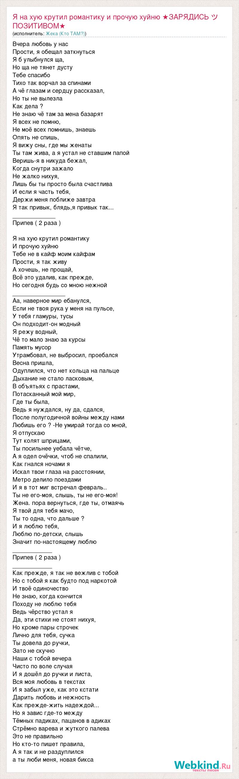 Вчера любовь у нас Прости, я обещал заткнуться Я б улыбнулся ща, Но ща не тянет дусту Тебе спасибо Тихо так ворчал за спинами А чё глазам и сердцу рассказал, Но ты не вылезла Как дела ? Не знаю чё там за мена базарят Я всех не помню, Не моё всех помнишь, знаешь Опять не спишь, Я вижу сны, где мы женаты Ты там жива, а я устал не ставшим папой Веришь-я в никуда бежал, Когда снутри зажало Не жалко нихуя, Лишь бы ты просто была счастлива И если я часть тебя, Держи меня поближе завтра Я так привык, блядь,я привык так... _____________ Припев ( 2 раза ) Я на хую крутил романтику И прочую хуйню Тебе не в кайф моим кайфам Прости, я так живу А хочешь, не прощай, Всё это удалив, как прежде, Но сегодня будь со мною нежной ________________ Аа, наверное мир ебанулся, Если не твоя рука у меня на пульсе, У тебя гламуры, тусы Он подходит-он модный Я режу водный, Чё то мало знаю за курсы Память мусор Утрамбовал, не выбросил, проебался Весна пришла, Одуплился, что нет кольца на пальце Дыхание не стало ласковым, В объятьях с прастами, Потасканный мой мир, Где ты была, Ведь я нуждался, ну да, сдался, После полугодичной войны между нами Любишь его ? -Не умирай тогда со мной, Я отпускаю Тут колят шприцами, Ты посильнее уебала чётче, А я одел очёчки, чтоб не спалили, Как гнался ночами я Искал твои глаза на расстоянии, Метро делило поездами И я в тот миг встречал февраль.. Ты не его-моя, слышь, ты не его-моя! Жена. пора вернуться, где ты, отмаячь Я твой для тебя мачо, Ты то одна, что дальше ? И я люблю тебя, Люблю по-детски, слышь Значит по-настоящему люблю ____________ Припев ( 2 раза ) ____________ Как прежде, я так не вежлив с тобой Но с тобой я как будто под наркотой И твоё одиночество Не знаю, когда кончится Походу не люблю тебя Ведь чёрство устал я Да, эти стихи не стоят нихуя, Но кроме пары строчек Лично для тебя, сучка Ты довела до ручки, Зато не скучно Наши с тобой вечера Чисто по воле случая И я дошёл до ручки и листа, Вся моя любовь в текстах И я забыл уже, как это кстати Дарить любовь и нежность Как прежде-жить надеждой... Но я завис где-то между Тёмных падиках, пацанов в адиках Стрёмно варева и жуткого палева Это не правильно Но кто-то пишет правила, А я так и не раздуплился а ты люби меня, новая бикса
