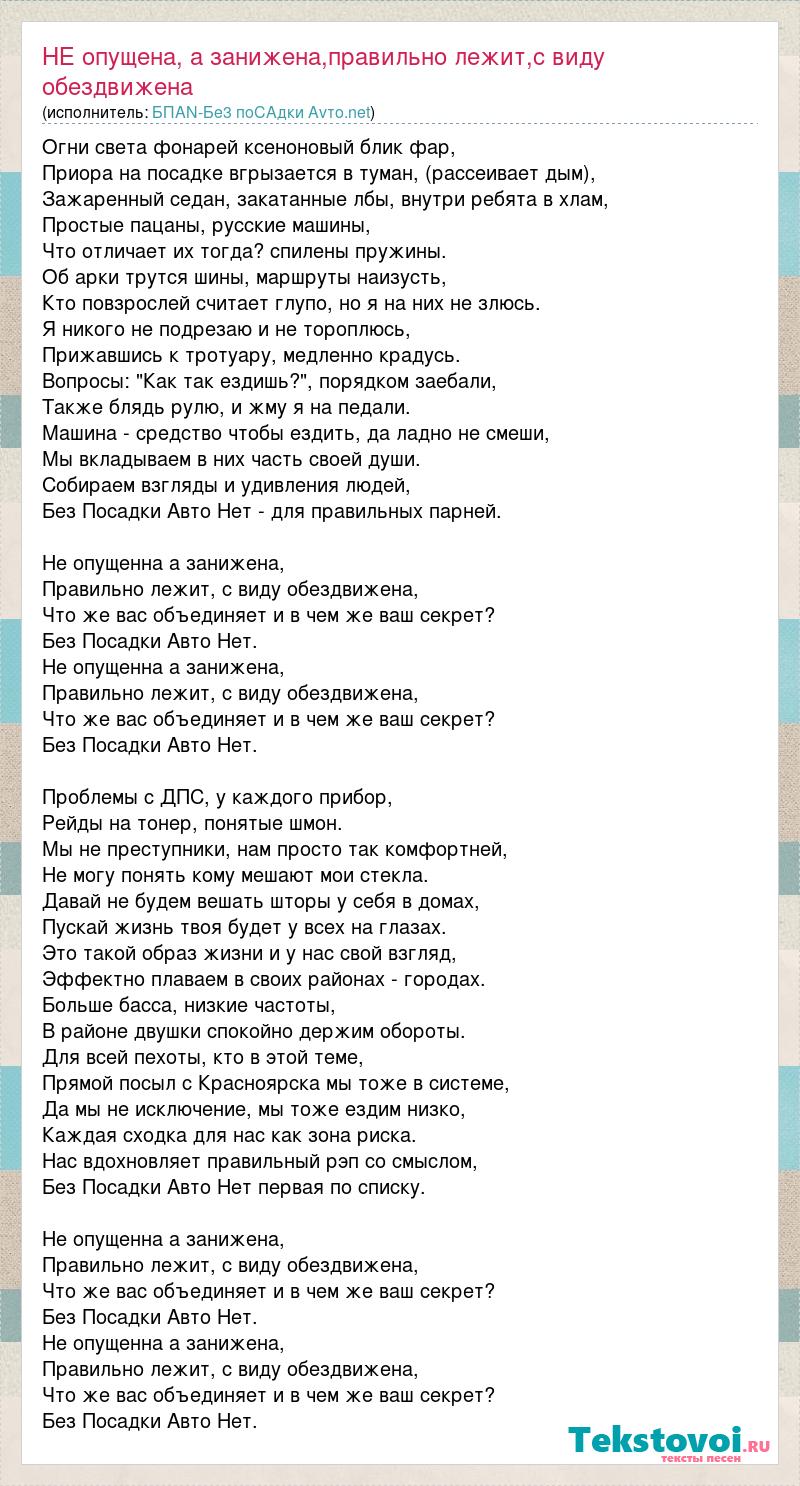 Огни света фонарей ксеноновый блик фар, Приора на посадке вгрызается в туман, (рассеивает дым), Зажаренный седан, закатанные лбы, внутри ребята в хлам, Простые пацаны, русские машины, Что отличает их тогда? спилены пружины. Об арки трутся шины, маршруты наизусть, Кто повзрослей считает глупо, но я на них не злюсь. Я никого не подрезаю и не тороплюсь, Прижавшись к тротуару, медленно крадусь. Вопросы: "Как так ездишь?", порядком заебали, Также блядь рулю, и жму я на педали. Машина - средство чтобы ездить, да ладно не смеши, Мы вкладываем в них часть своей души. Собираем взгляды и удивления людей, Без Посадки Авто Нет - для правильных парней. Не опущенна а занижена, Правильно лежит, с виду обездвижена, Что же вас объединяет и в чем же ваш секрет? Без Посадки Авто Нет. Не опущенна а занижена, Правильно лежит, с виду обездвижена, Что же вас объединяет и в чем же ваш секрет? Без Посадки Авто Нет. Проблемы с ДПС, у каждого прибор, Рейды на тонер, понятые шмон. Мы не преступники, нам просто так комфортней, Не могу понять кому мешают мои стекла. Давай не будем вешать шторы у себя в домах, Пускай жизнь твоя будет у всех на глазах. Это такой образ жизни и у нас свой взгляд, Эффектно плаваем в своих районах - городах. Больше басса, низкие частоты, В районе двушки спокойно держим обороты. Для всей пехоты, кто в этой теме, Прямой посыл с Красноярска мы тоже в системе, Да мы не исключение, мы тоже ездим низко, Каждая сходка для нас как зона риска. Нас вдохновляет правильный рэп со смыслом, Без Посадки Авто Нет первая по списку. Не опущенна а занижена, Правильно лежит, с виду обездвижена, Что же вас объединяет и в чем же ваш секрет? Без Посадки Авто Нет. Не опущенна а занижена, Правильно лежит, с виду обездвижена, Что же вас объединяет и в чем же ваш секрет? Без Посадки Авто Нет.