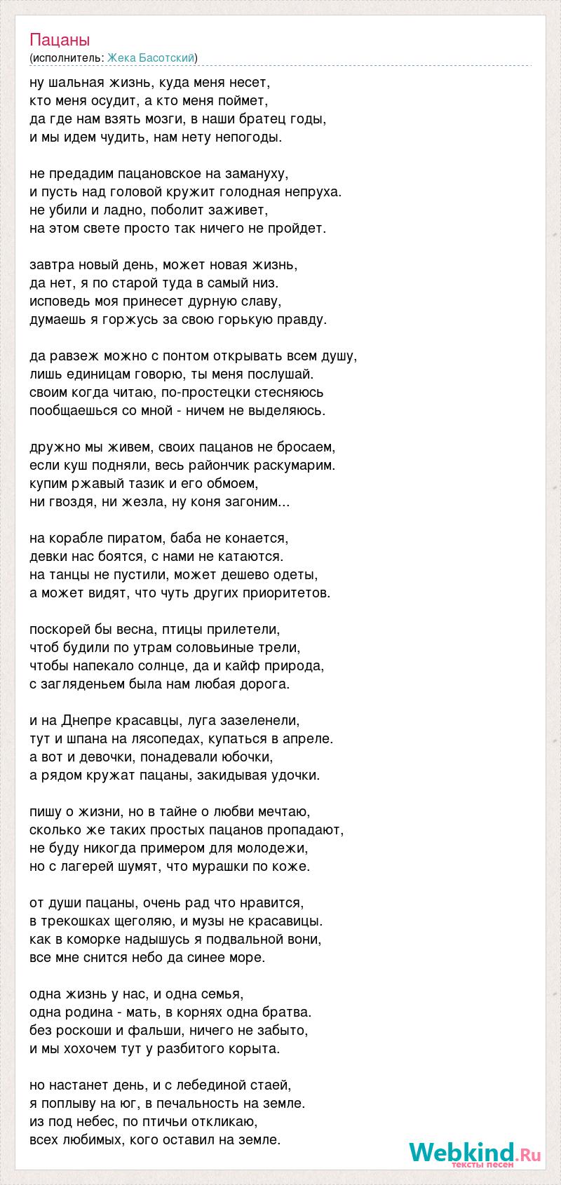 ну шальная жизнь, куда меня несет, кто меня осудит, а кто меня поймет, да где нам взять мозги, в наши братец годы, и мы идем чудить, нам нету непогоды. не предадим пацановское на замануху, и пусть над головой кружит голодная непруха. не убили и ладно, поболит заживет, на этом свете просто так ничего не пройдет. завтра новый день, может новая жизнь, да нет, я по старой туда в самый низ. исповедь моя принесет дурную славу, думаешь я горжусь за свою горькую правду. да равзеж можно с понтом открывать всем душу, лишь единицам говорю, ты меня послушай. своим когда читаю, по-простецки стесняюсь пообщаешься со мной - ничем не выделяюсь. дружно мы живем, своих пацанов не бросаем, если куш подняли, весь райончик раскумарим. купим ржавый тазик и его обмоем, ни гвоздя, ни жезла, ну коня загоним... на корабле пиратом, баба не конается, девки нас боятся, с нами не катаются. на танцы не пустили, может дешево одеты, а может видят, что чуть других приоритетов. поскорей бы весна, птицы прилетели, чтоб будили по утрам соловьиные трели, чтобы напекало солнце, да и кайф природа, с загляденьем была нам любая дорога. и на Днепре красавцы, луга зазеленели, тут и шпана на лясопедах, купаться в апреле. а вот и девочки, понадевали юбочки, а рядом кружат пацаны, закидывая удочки. пишу о жизни, но в тайне о любви мечтаю, сколько же таких простых пацанов пропадают, не буду никогда примером для молодежи, но с лагерей шумят, что мурашки по коже. от души пацаны, очень рад что нравится, в трекошках щеголяю, и музы не красавицы. как в коморке надышусь я подвальной вони, все мне снится небо да синее море. одна жизнь у нас, и одна семья, одна родина - мать, в корнях одна братва. без роскоши и фальши, ничего не забыто, и мы хохочем тут у разбитого корыта. но настанет день, и с лебединой стаей, я поплыву на юг, в печальность на земле. из под небес, по птичьи откликаю, всех любимых, кого оставил на земле.