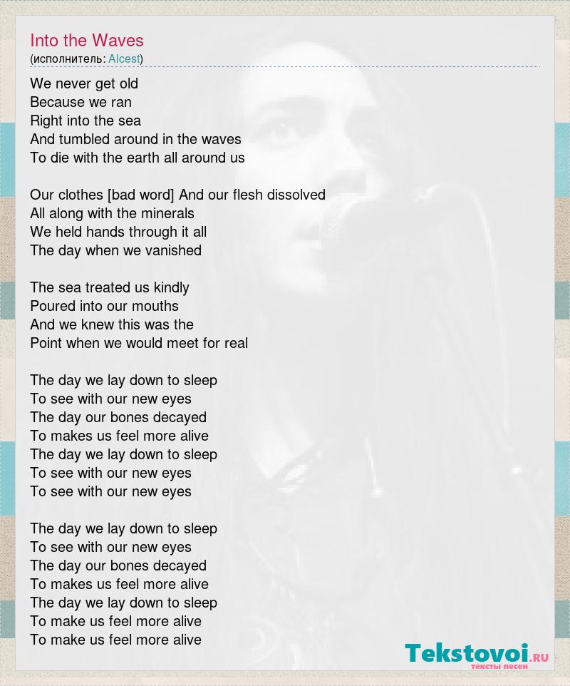 We never get old Because we ran Right into the sea And tumbled around in the waves To die with the earth all around us Our clothes decomposed And our flesh dissolved All along with the minerals We held hands through it all The day when we vanished The sea treated us kindly Poured into our mouths And we knew this was the Point when we would meet for real The day we lay down to sleep To see with our new eyes The day our bones decayed To makes us feel more alive The day we lay down to sleep To see with our new eyes To see with our new eyes The day we lay down to sleep To see with our new eyes The day our bones decayed To makes us feel more alive The day we lay down to sleep To make us feel more alive To make us feel more alive