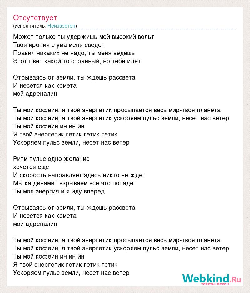 Может только ты удержишь мой высокий вольт Твоя ирония с ума меня сведет Правил никаких не надо, ты меня ведешь Этот цвет какой то странный, но тебе идет Отрываясь от земли, ты ждешь рассвета И несется как комета мой адреналин Ты мой кофеин, я твой энергетик просыпается весь мир-твоя планета Ты мой кофеин, я твой энергетик ускоряем пульс земли, несет нас ветер Ты мой кофеин ин ин ин Я твой энергетик гетик гетик гетик Ускоряем пульс земли, несет нас ветер Ритм пульс одно желание хочется еще И скорость направляет здесь никто не ждет Мы ка динамит взрываем все что попадет Ты моя энергия и я иду вперед Отрываясь от земли, ты ждешь рассвета И несется как комета мой адреналин Ты мой кофеин, я твой энергетик просыпается весь мир-твоя планета Ты мой кофеин, я твой энергетик ускоряем пульс земли, несет нас ветер Ты мой кофеин ин ин ин Я твой энергетик гетик гетик гетик Ускоряем пульс земли, несет нас ветер