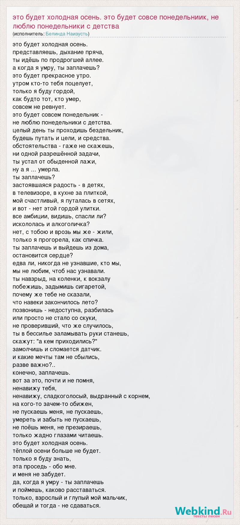 Главная→Исполнители→Белинда Наизусть→Это будет холодная осень. это будет совсе понедельниик, не люблю понедельни