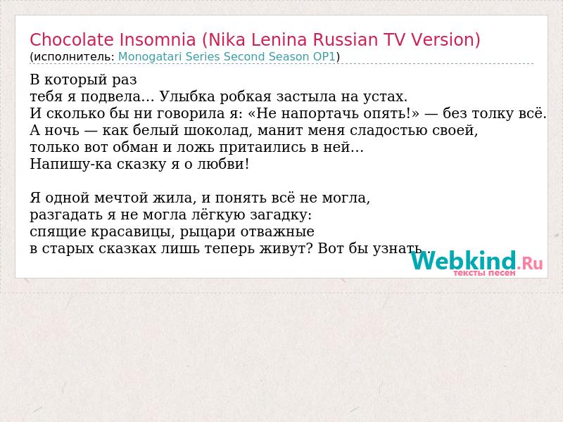 Главная→Исполнители→Monogatari Series Second Season OP1→Chocolate Insomnia (Nika Lenina Russian TV Version)